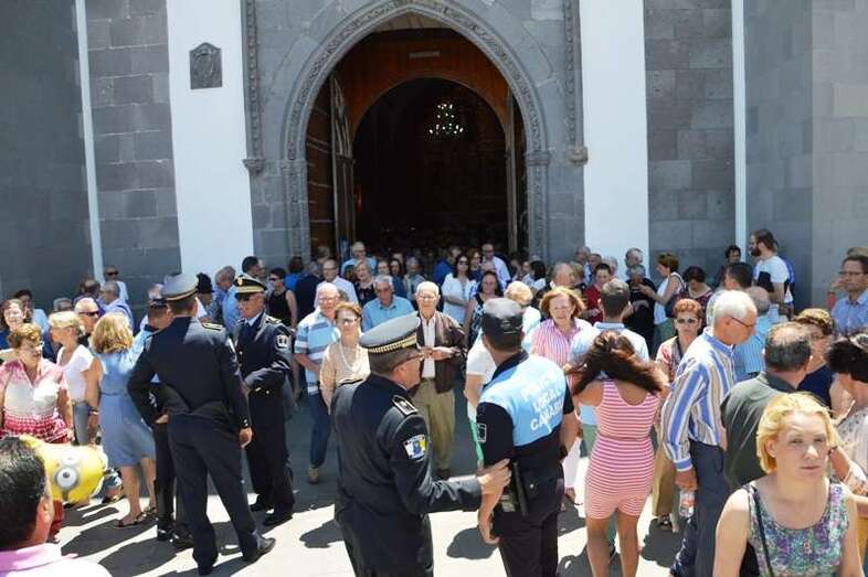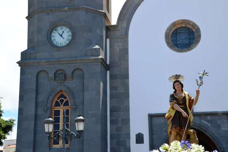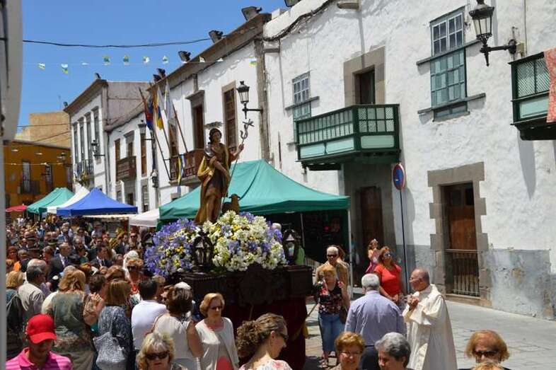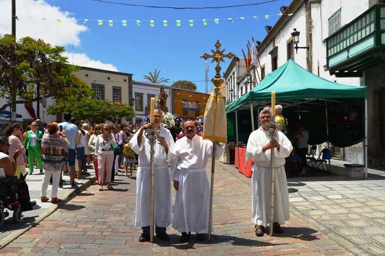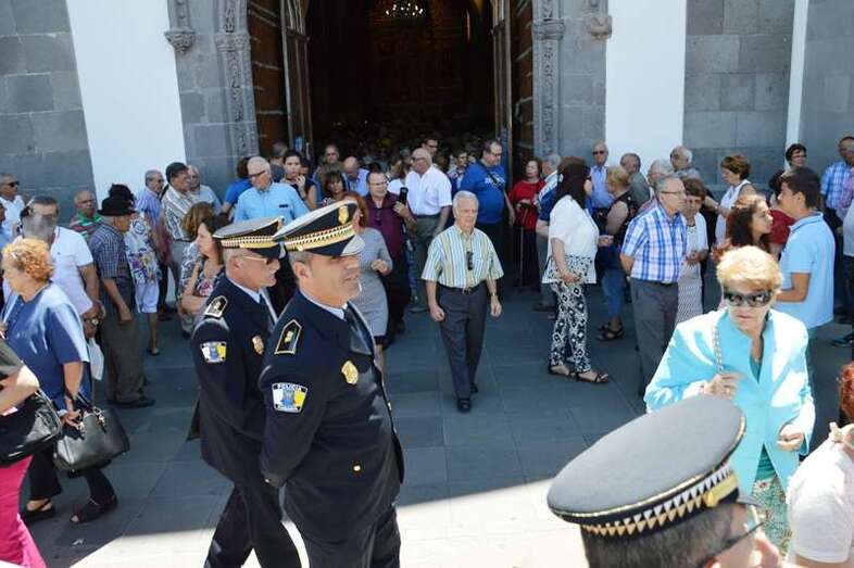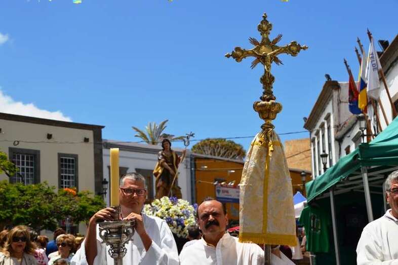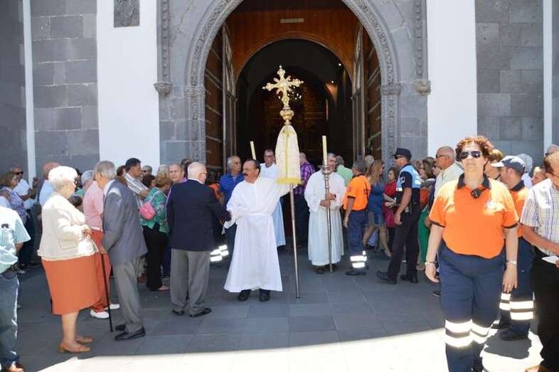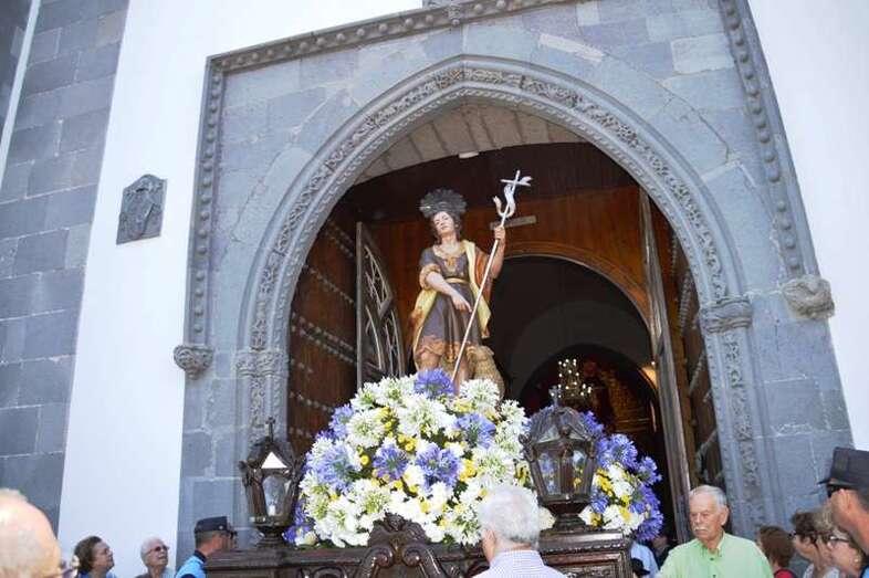El trono del patrono de la ciudad, bellamente engalanado con un adorno floral, enfiló la salida del templo matriz de Telde pasadas las 12.45 horas, a los pocos minutos de terminar la solemne eucaristía presidida por Jorge Martín de la Coba, hijo de Telde y párroco de Tamaraceite.