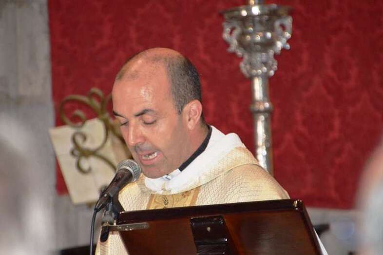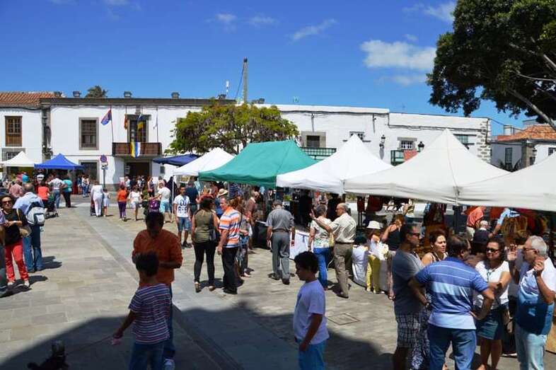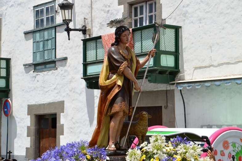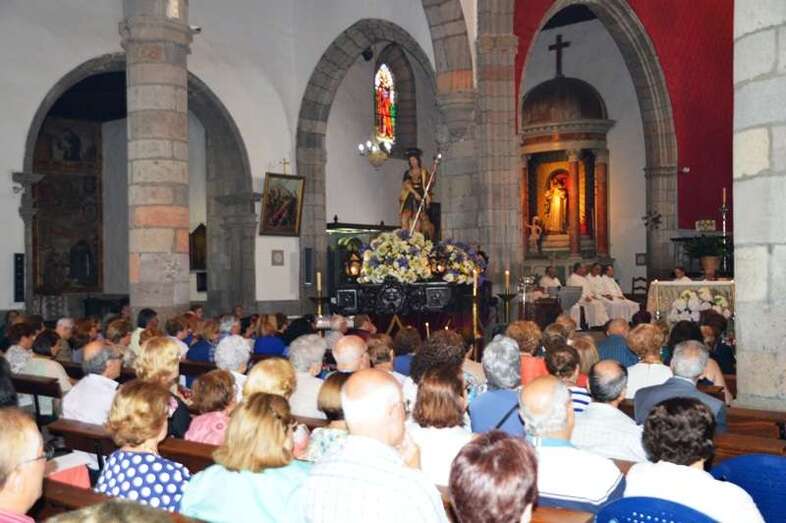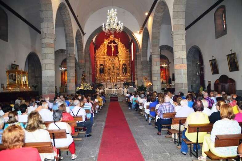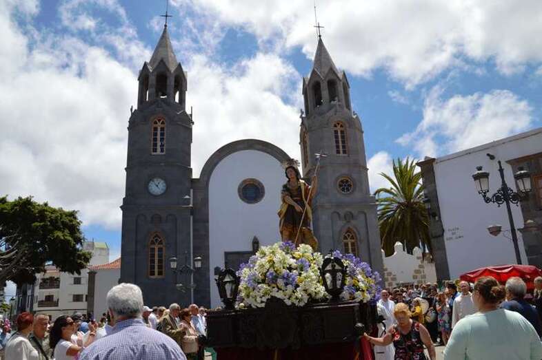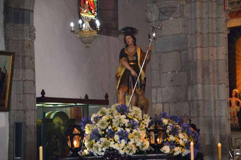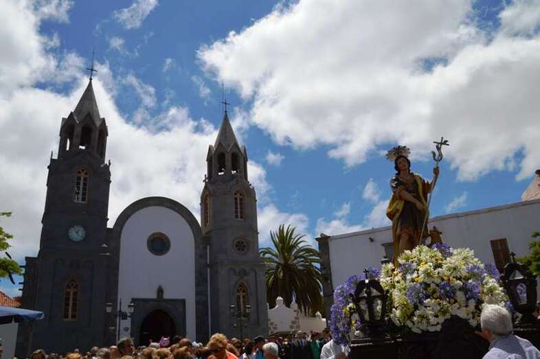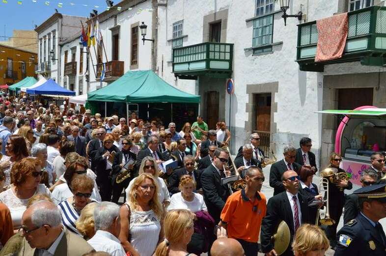 El trono del patrono de la ciudad, bellamente engalanado con un adorno floral, enfiló la salida del templo matriz de Telde pasadas las 12.45 horas, a los pocos minutos de terminar la solemne eucaristía presidida por Jorge Martín de la Coba, hijo de Telde y párroco de Tamaraceite.