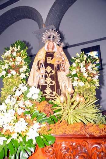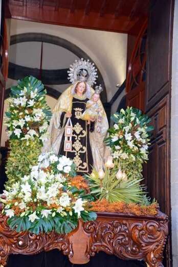 Engalanada con un lucido adorno floral y entronizada en su paso procesional, la Virgen del Carmen iniciaba su periplo por las calles del núcleo comercial más próximas a la plaza de San Gregorio y al templo.