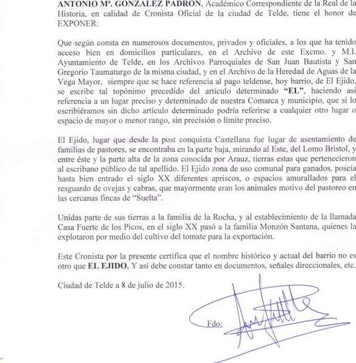 Debo decir que me enorgullezco que en la manifestación convocada por mí cuando empezó todo este asunto , acudió más gente de la que lo hace en las procesiones y diferentes actos que él convoca y que la justicia , la historia y el sentido común  me dan la razón en esta lucha; además quiero agradecer enormemente la inestimable ayuda de Don Antonio,  el Cronista Oficial de Telde, que me certificó con toda la autoridad y el criterio  del mundo que el nombre de mi barrio es El Ejido y no como lo mentan , él y esas personas que le apoyan; también quiero darle las gracias a TELDEACTUALIDAD por nominarlo con su toponimia  real  y auténtica en cada una de las noticias a las que a él se refiere y  a los  vecinos y vecinas que, desde el anonimato, me dan la razón y es que…con los vecinos hay que llevarse bien, aunque sean ellos los que hagan el mal, aunque  siempre su razón sea la sinrazón.