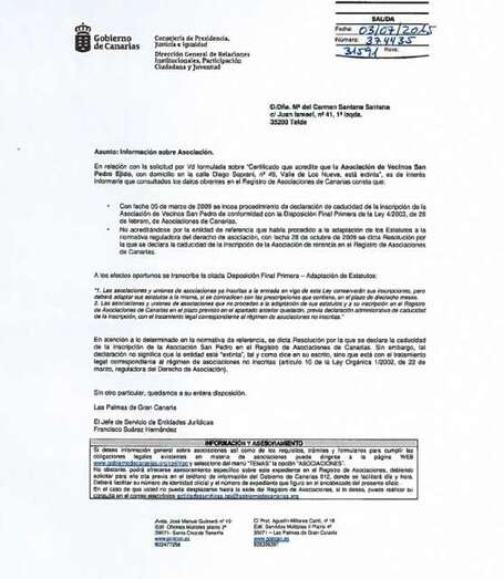 Me marché de esa airada visita después de decirle que iría a hablar con el presidente, para , como mínimo hacerme socia ,  de esa inexistente asociación, al menos que yo sepa  y de lo cual adjunto el documento que lo acredita del Registro de Asociaciones del Gobierno de Canarias y no me consta que tampoco lo esté en el Registro de las de Telde;  antes pasé por Patrimonio para que la secretaria del concejal que lleva el área me diera cita para hablar con él… pero visto lo visto y escuchado lo escuchado, he decidido no acudir a la misma, aunque me llamaron para que fuera a hablar con él , el pasado miércoles.