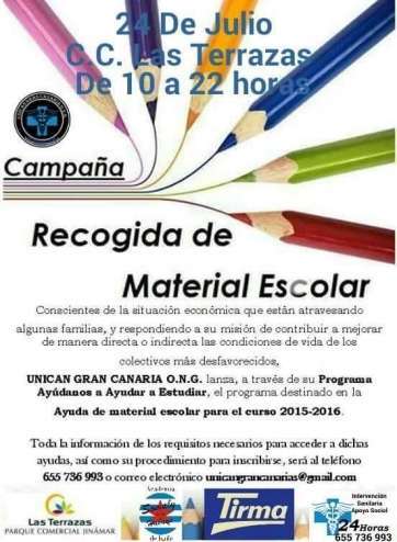 Telde.- La ong Unican Gran Canaria ha organizado este viernes, 24 de julio, una recogida solidaria de material escolar en el Centro Comercial Las Terrazas, en Telde, en horario de 10.00 a 22.00 horas.