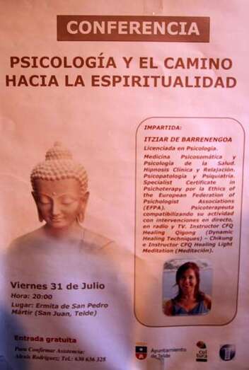 Con un lleno total por el interés suscitado en los temas a tratar, la tarde del pasado viernes 31 de julio, la ermita de San Pedro Mártir en el casco histórico de la ciudad de Telde, se vio hasta la bandera gracias al acierto del trabajador municipal Alexis Rodríguez y la Concejalía de Cultura del Ayuntamiento de Telde, de lograr un encuentro tan humano, espiritual y de concienciación frente a los consejos de una profesional, experimentada, con la actitud y aptitud generosa de acercarnos a ciertas respuestas o por lo menos considerar en su amplia exposición los interesantes puntos de vista que su especialidad profesional y experiencia personal ha llegado a definir, la doctora Itziar de Barrenengoa Cuadra, en su conferencia Psicología y el camino hacia la espiritualidad.