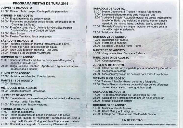 Concretamente, las fiestas arrancarán este viernes 14 de agosto a las 22.00 horas con el pregón a cargo del cronista oficial de Telde, Antonio Mª González Padrón, acto que dará paso al extenso programa diseñado por la Asociación de Vecinos Unidos de la playa de Tufia.