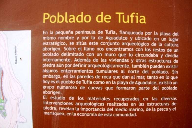 Tufia quizás no fuera tan importante ya que la población de Telde hasta Arguineguín vivía en Tara, Cendro y estribaciones del Barranco Real, lugares del que se hablan que había hasta catorce mil casas. Tufia fue un poblado bien situado para la vigilancia del mar, y de pastores que cuidaban el ganado, el cerdo prehispánico, la cabra y la oveja. Vivían a sotavento en las partes altas donde se centró esta población, promontorio visible desde la distancia conocido por los marineros de Melenera como el Morro de la Ballena. La naturaleza hizo que este pequeño poblado de Tufia tuviera una fuente de agua dulce, que fue poblado posterior ya que a nivel de la playa de su nombre existían remanentes de agua dulce que permitían su abasto por los aborígenes. Aguadulce es playa orientada el nordeste entre el promontorio de Tufia y la costa teldense.