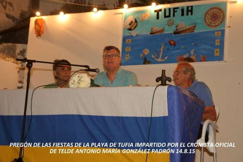 El viernes 14 de agosto se celebró el Pregón de las fiestas de la zona costera teldense de Tufia, que impartió el Cronista Oficial de Telde, Antonio María González Padrón, con arreglo al programa festivo elaborado en honor a la Virgen de la Milagrosa. A las 22:00 hs. se inicia este acto presidido por Juan Sánchez Herrera, presidente de la Asociación para la Defensa de las Viviendas de Tufia, que da la bienvenida al público y al Cronista, presentado por el secretario de la Asociación, Fernando Báez Vega, profesor y biólogo.