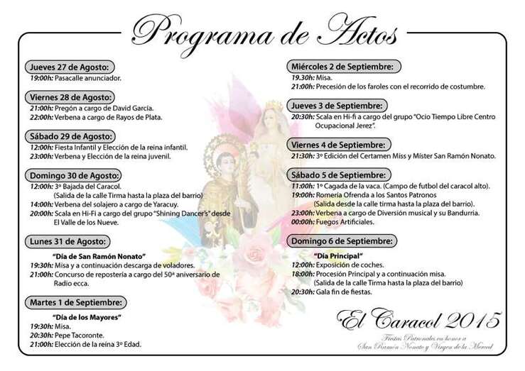 Serán 11 días de conmemoración los que se podrán disfrutar en el barrio del Caracol. Así tras el pregón, los días consecutivos se celebrarán multitud de actividades que divertirán a pequeños y mayores, programadas por el Patronato de Fiestas, Cultura y Deporte que preside Ángeles Artiles Silva.