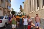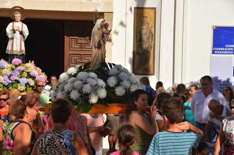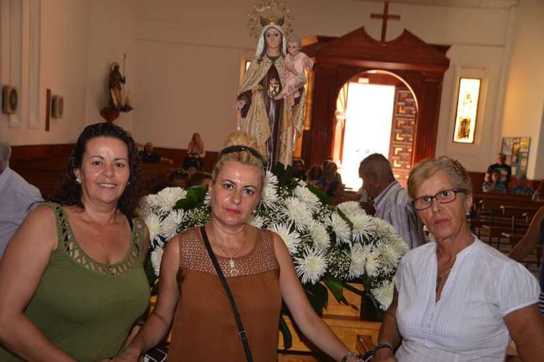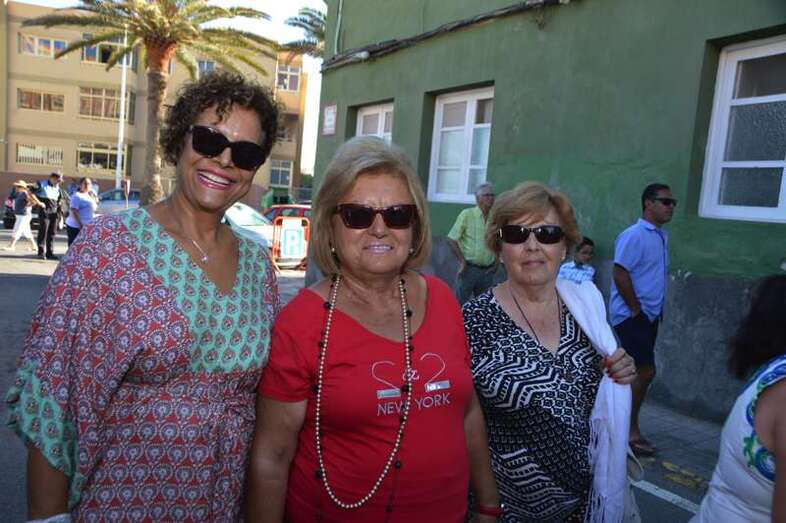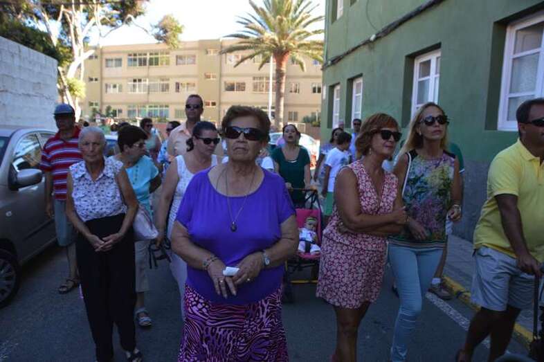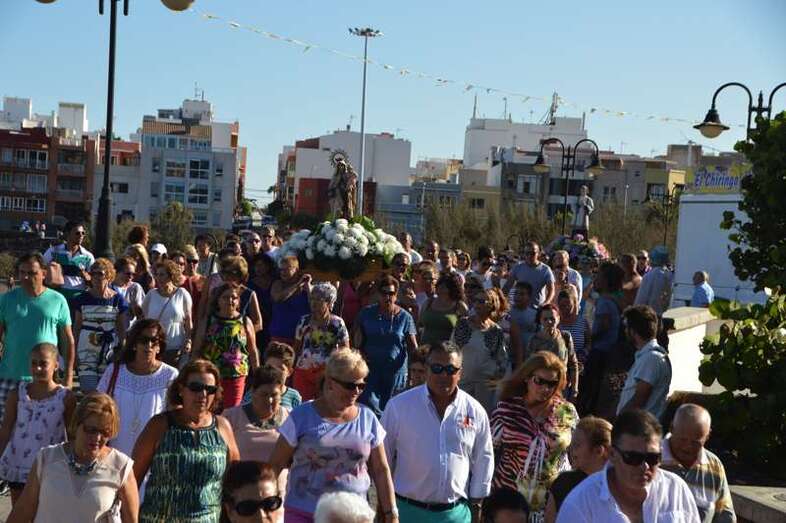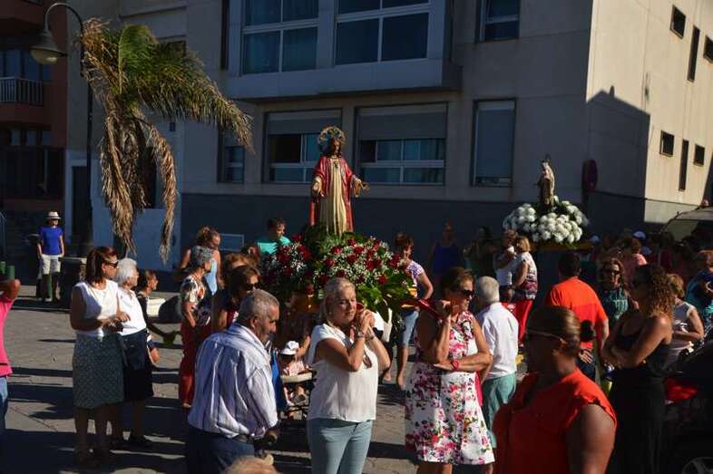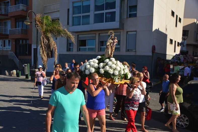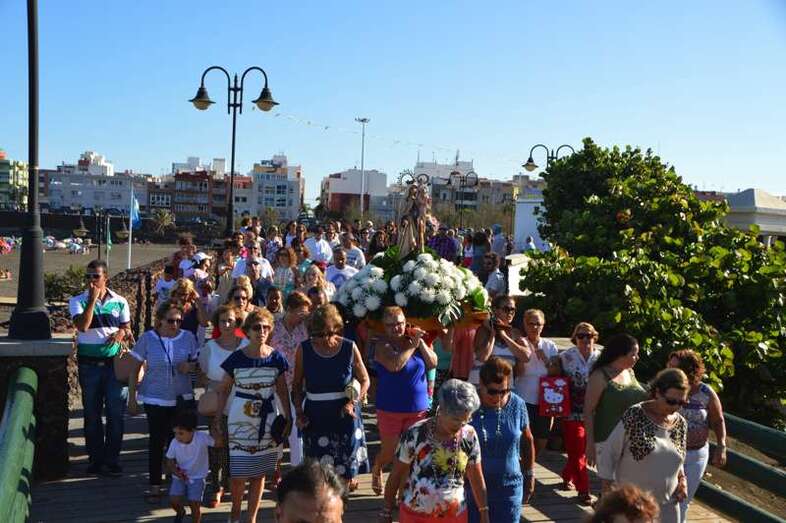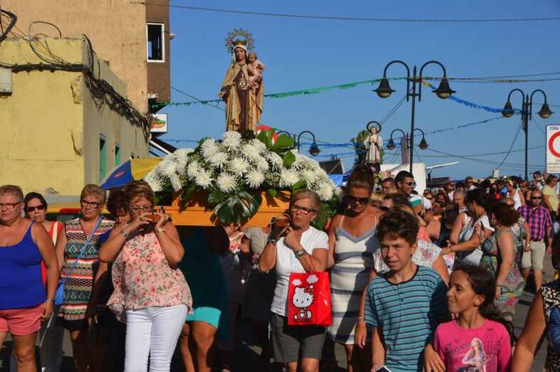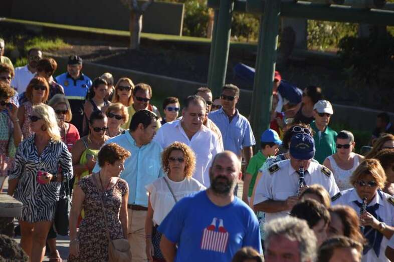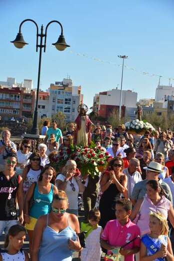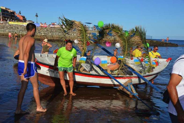 Después de un recorrido por la avenida de Melenara, la procesión enfilo el sector viejo de esta playa donde fue saludada por varias descargas de voladores y los vivas del público. Poco a poco, las imágenes se fueron acercando hasta la arena de la playa, en donde les esperaban las tres embarcaciones de pescadores que las pasearían por el litoral de Melenara, Taliarte, Claveillas y Salinetas.