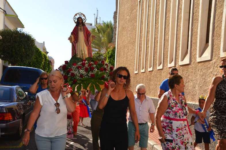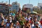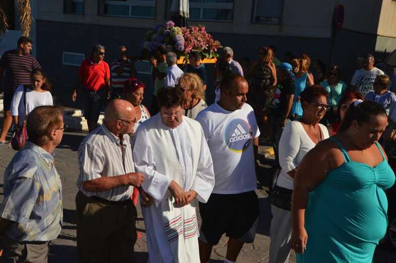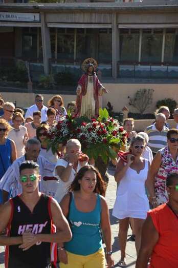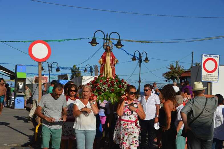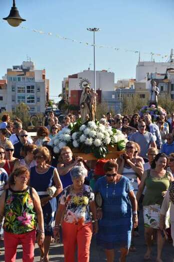 La comitiva religiosa, acompañada por la Banda Municipal de Música y numerosos fieles, efectuó el trayecto habitual por la arena y calles de esta playa, donde la Virgen del Carmen, el Corazón de Jesús y el Santo Cura de Ars fueron acogidos con repiques de campanas y aplausos.