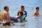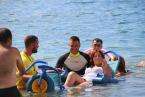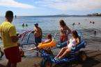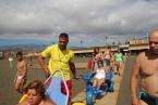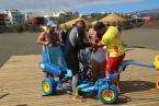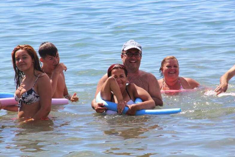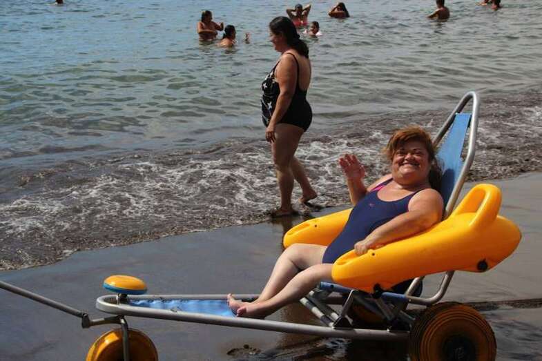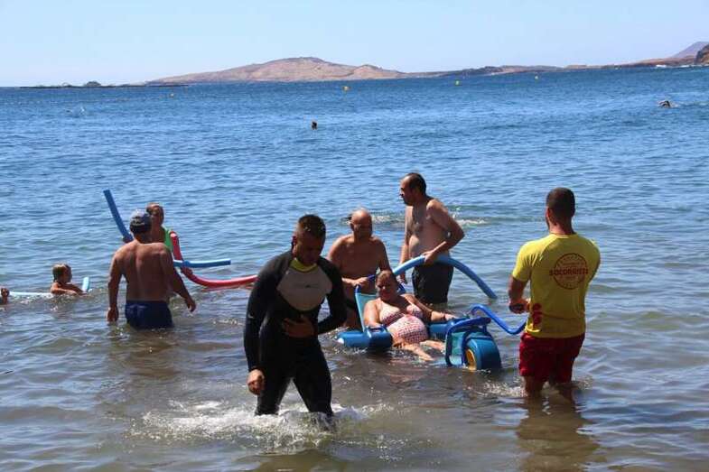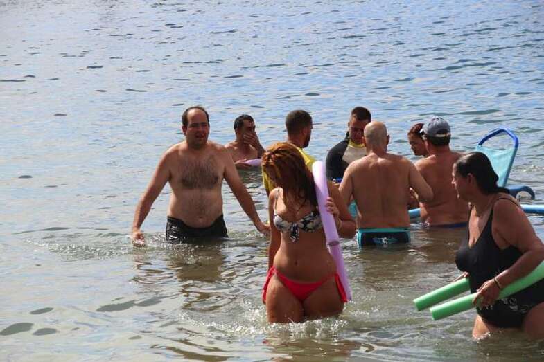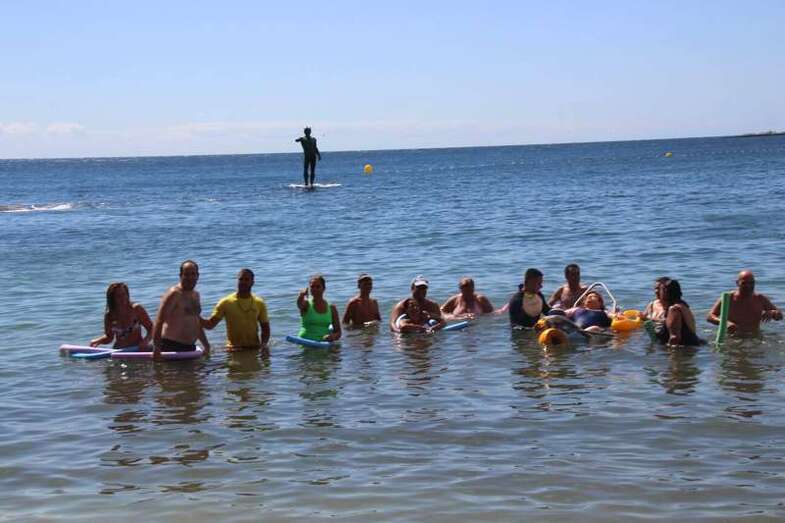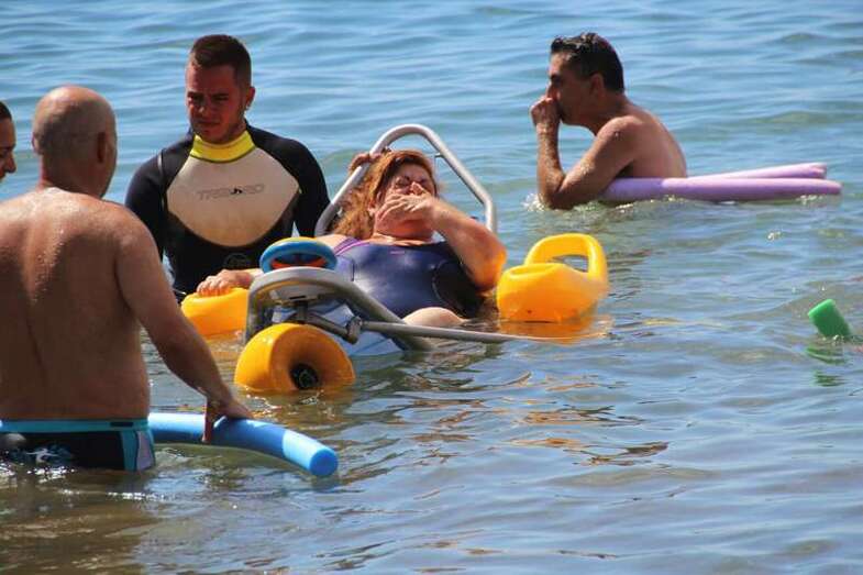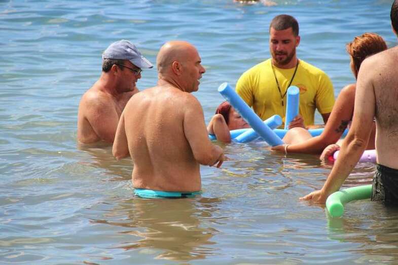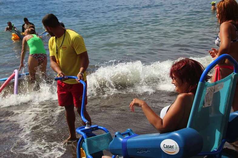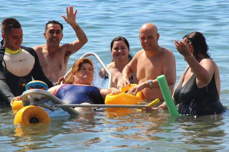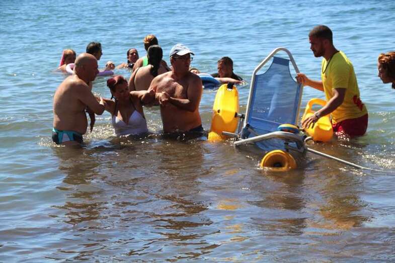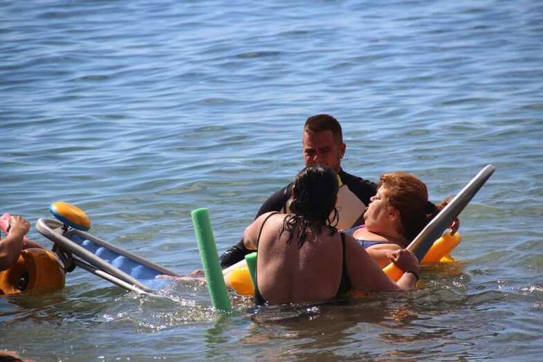 Los integrantes de la asociación, con la colaboración de las concejalías de Actividad Física y Deportes y Playas y la empresa que presta el servicio de vigilancia, primeros auxilios y socorrismo en la playa, Proactiva, hicieron uso de las dos sillas anfibias y los seis pares de muletas con los que cuenta la playa.