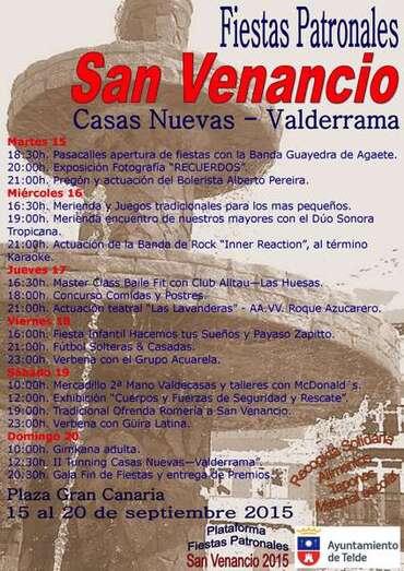 19.00 horas: Tradicional Ofrenda-Romería a San Venancio y al término de la misma, en la plaza Gran Canaria, fiesta canaria con actuaciones de grupos folclóricos y elección de romera y romero San Venancio 2015.