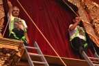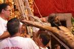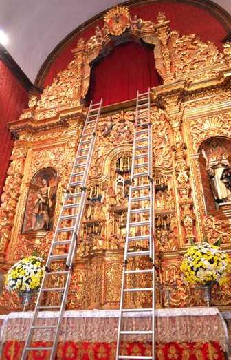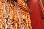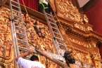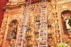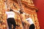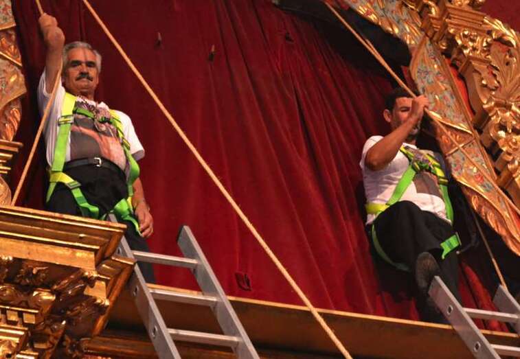 Tras ser trasladada por cerca de una decena de sacerdotes desde su trono móvil, ubicado a los pies del presbiterio, hasta los primeros peldaños de las escaleras colocadas a ambos lados de la hornacina, los seis porteadores y el equipo de mayordomos iniciaron el izado de la efigie ayudados por un sencillo sistema de cuerdas y correas.