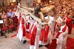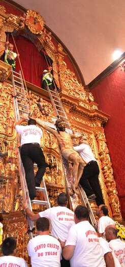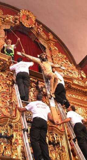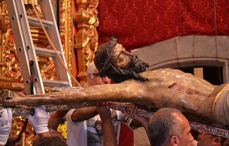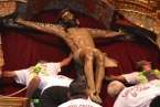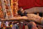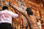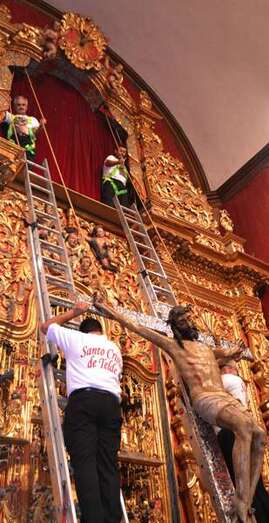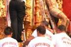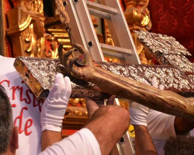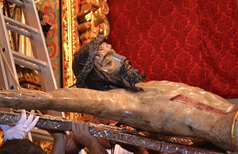 Esta noche, al filo de las 20.30 horas, tras la eucaristía oficiada por el sacerdote claretiano Vicente Cuadrado, que durante la homilía insistió en que los critianos tienen que "acompañar" más que nunca a Jesús en una sociedad "cada vez más alejada de los valores de los creyentes", el Santo Cristo regresaba al lugar en donde descansa habitualmente, a más de siete metros de altura, en lo alto del templo matriz de la ciudad.