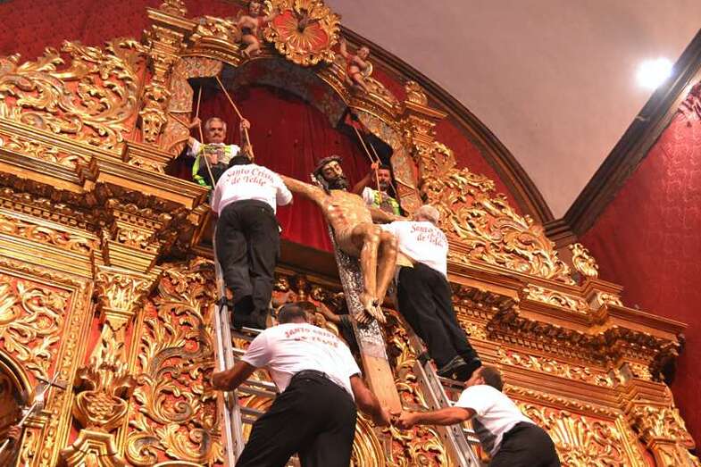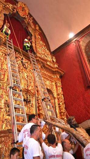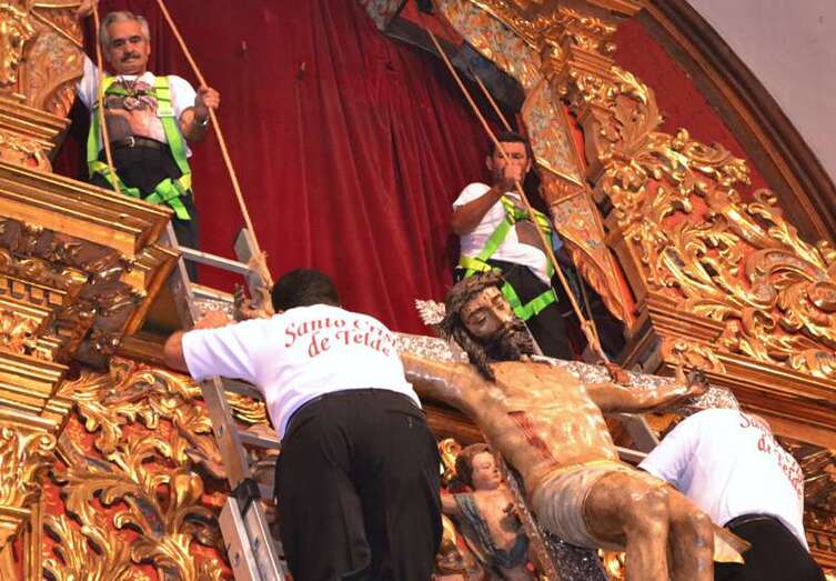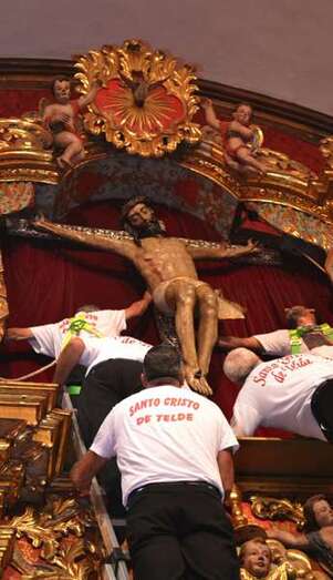 Fue en ese preciso instante cuando la emoción se desató. Entre gritos de “¡Viva el Santo Cristo de Telde!", las lágrimas y los aplausos de la muchedumbre, algunos no quisieron incluso perder la ocasión de retratar la maniobra con sus móviles, poco a poco, y con una apacible cadencia, la imagen fue ascendiendo con serenidad hasta ser depositada en la hornacina del retablo flamenco. La Banda de Música de Telde puso fin a la ceremonia interpretando la canción y el himno dedicado al Santo Cristo.