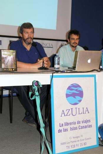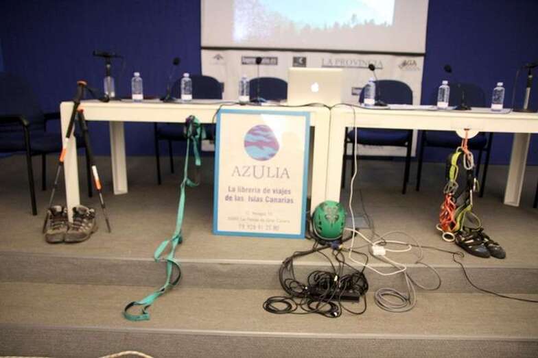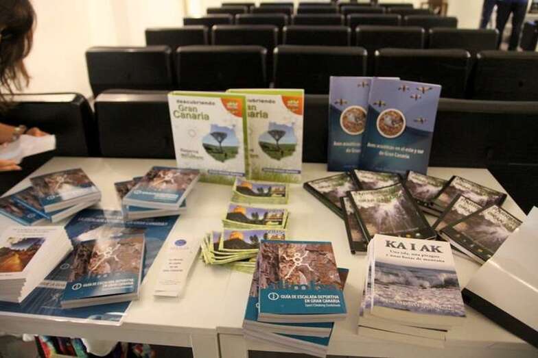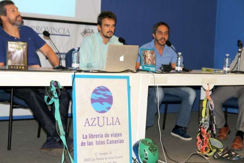 Letra y camino como decía Cervantes, nos encontramos aquí ante la letra y el camino, lo sintetizamos con el concepto de viaje y desde aquí el viaje al interior de Gran Canaria. Y para eso, esta propuesta con tres publicaciones que han salido en distintos momentos, dos de ellas recientemente y otra algunos años, pero que hacen contemplar la isla de Gran Canaria no solamente desde el mero paseo, deleite contemplativo, sino desde la acción. Descubriendo Gran Canaria, autor Álvaro Monzón Santana. Barranquismo en Gran Canaria, de Hedwig Solanas y Víctor España. Y la última de las publicaciones de Climbo, de la Escalada deportiva en Gran Canaria, autores Guillermo Sanahuja y Carlos Romay. Gracias por su asistencia y recordando que estos libros están a disposición en Azulia, librería de Viajes de las Islas Canarias”.