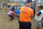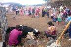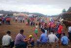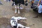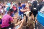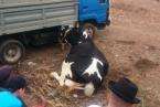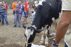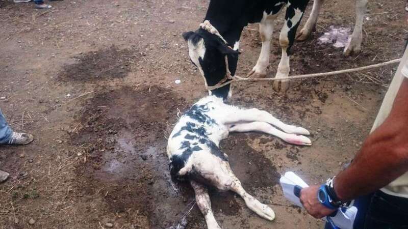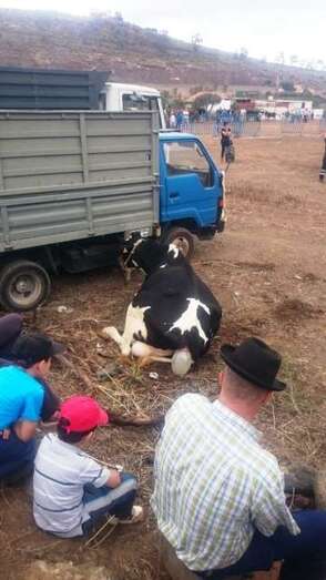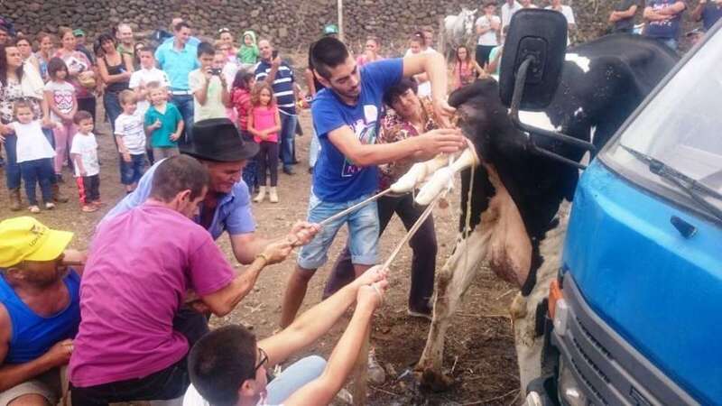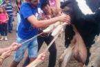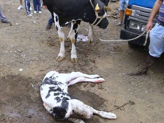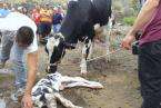Ganaderos que habían acudido a la muestra de animales ayudaron a la vaca de Emeterio López en el alumbramiento ante la sorpresa de las personas que presenciaban la feria organizada por la comisión de fiestas del Valle de los Nueve Alto.