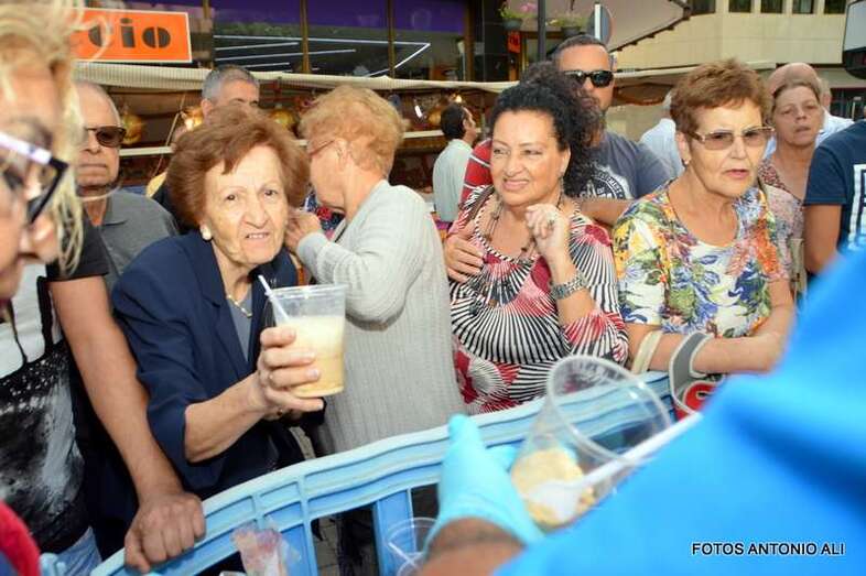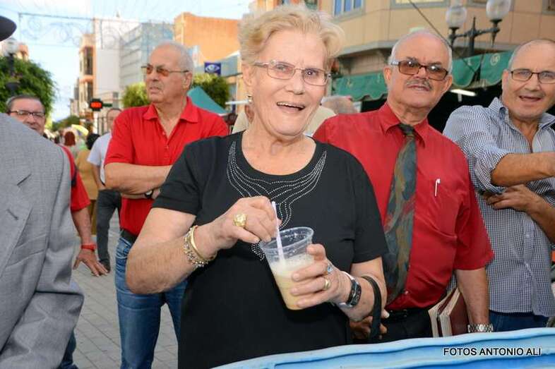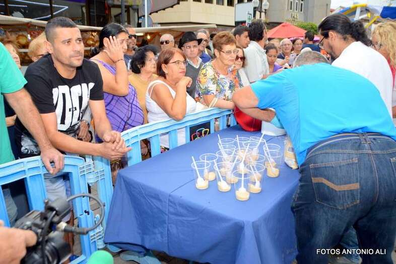 Telde.- Unos 20 litros, la producción de cuatro vacas de los ganaderos Antonio Sosa Alfonso, Pedro Montesdeoca y Francisco Hernández, recién ordeñadas en las inmediaciones de la plaza de Los Llanos a la vista del público, se distribuyeron esta mañana entre los ciudadanos que tuvieron la suerte de acceder a uno de los cientos de vasos de leche con gofio repartidos entre la población. TA avanza imágenes de la ordeñá y de la feria de ganado.
