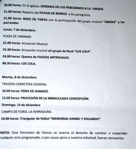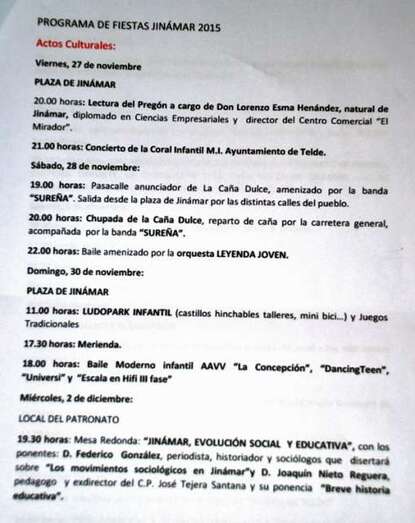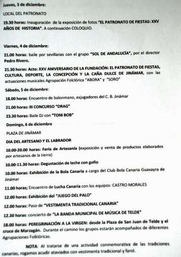 En lo que concierne al programa en sí, que se inicia el día 27 con la lectura del pregón por parte de Esma, destacan el pasacalles anunciador del día 28, la chupada de la caña dulce ese mismo día a partir de las 20.00 horas, la mesa redonda programada para el 2 de diciembre sobre los movimientos sociológicos en Jinámar, la inauguración de la muestra de fotos del Patronato el día 3, el reconocimiento oficial del día 4, el concurso drag de la jornada siguiente y ya, metidos en el fin de semana más intenso, el día del artesano y del labrador (6 de diciembre, con feria de artesanía, degustación de leche con gofio, lucha canaria, juego del palo, concierto de la banda municipal y peregrinación a la virgen, ofrenda, potaje de barroes y baile de taiflas), la apasionante víspera del 7 de diciembre con sus célebres fuegos artificiales y la feria de ganado y la procesión del Día de la Inmaculada.