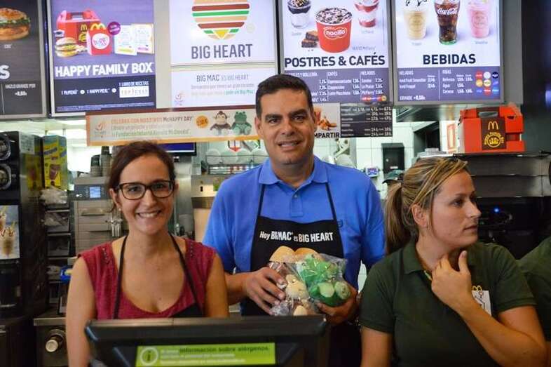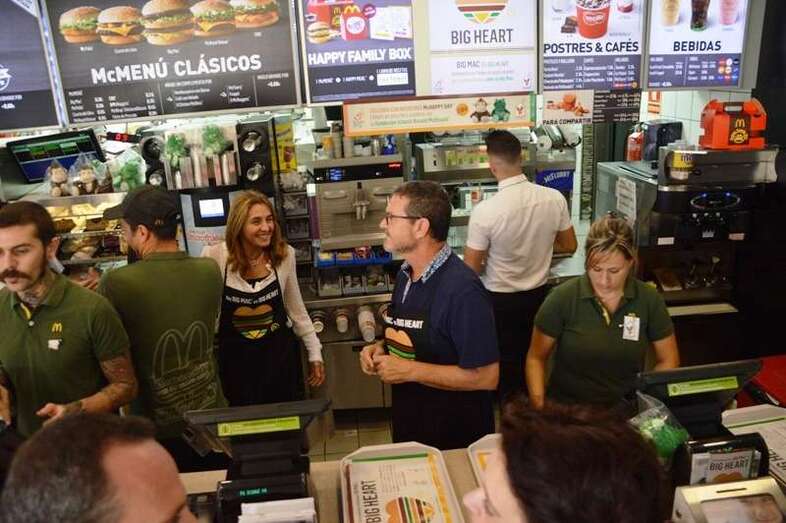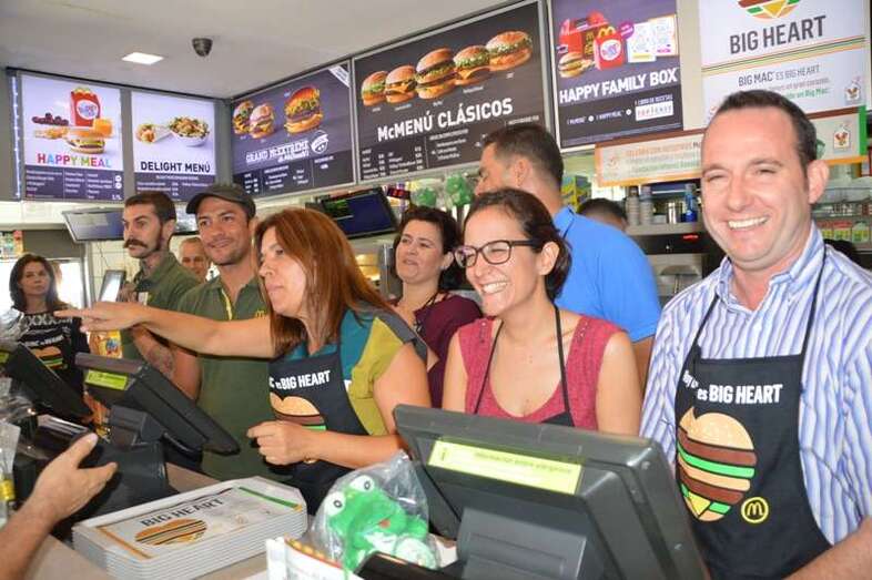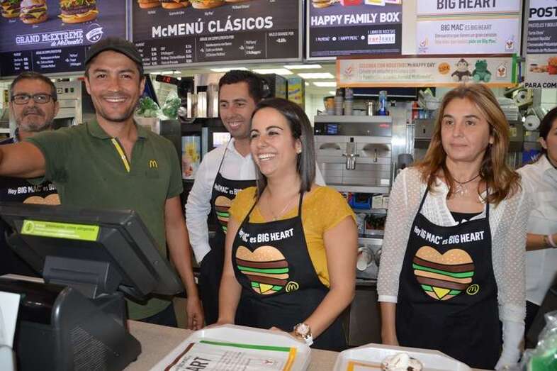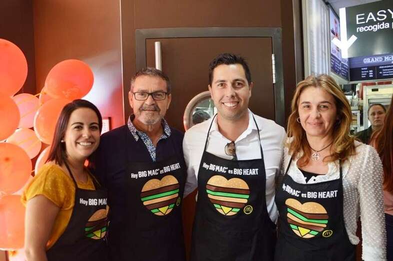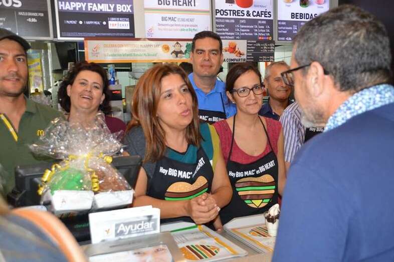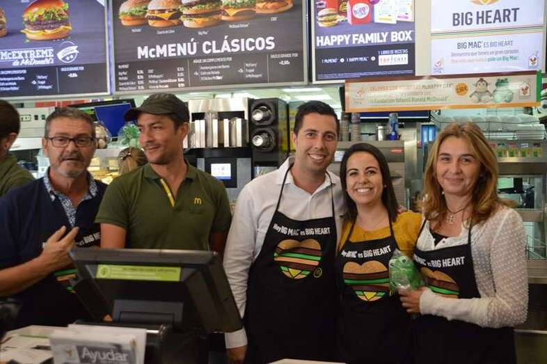 La alcaldesa Carmen Hernández, acompañada de un grupo de concejales del Gobierno de Telde; deportistas como el boxeador Ferino V, los atletas Doroteo Martín y Francisco Cabrera y el ciclista Marcos Santana, y la murga Los golisnionas se adhirieron a esta iniciativa y no dudaron en ponerse un mandil para atender a los clientes del establecimiento tras el mostrador, contribuyendo así al éxito de la fiesta más solidaria de la firma norteamericana de comidas rápida que realiza cada año en España y que tiene como objetivo destinar el 100% de lo recaudado con la venta de Big Mac a su fundación infantil Ronald McDonald, que se ocupa de gestionar alojamiento para familias con niños enfermos que reciben tratamiento lejos de su domicilio.