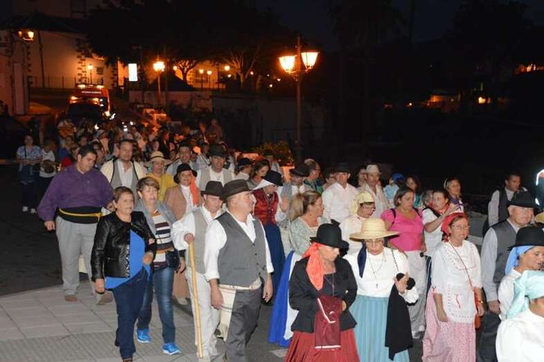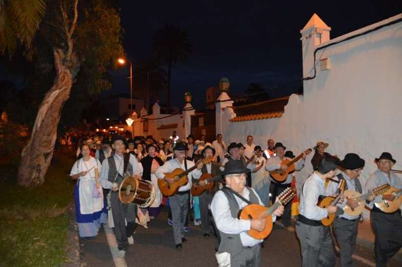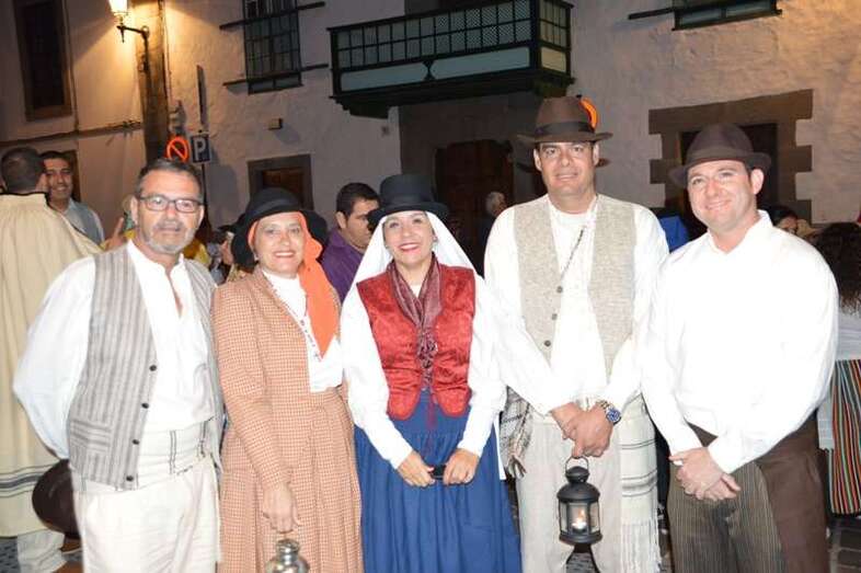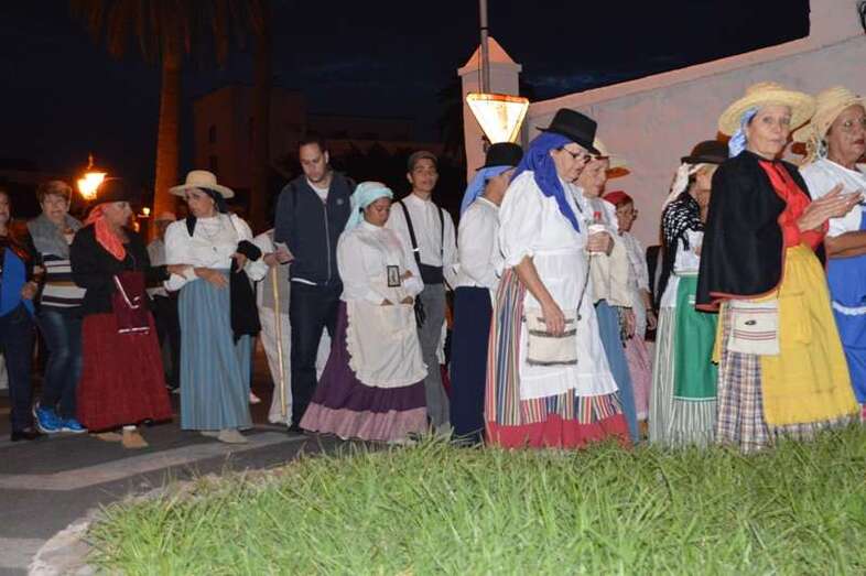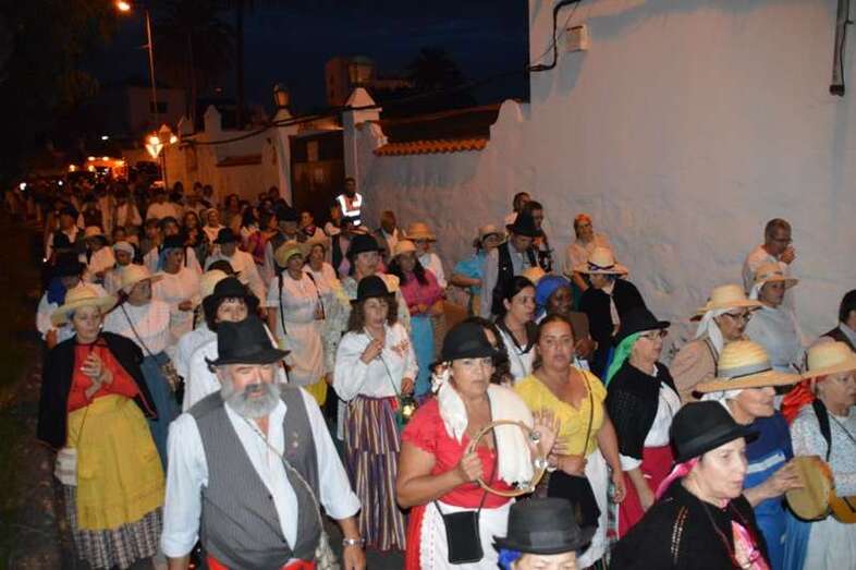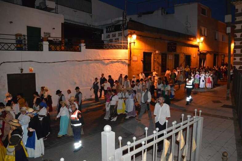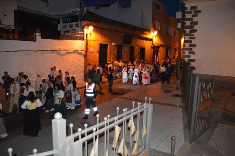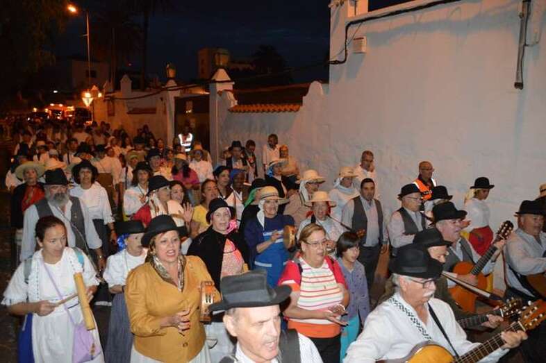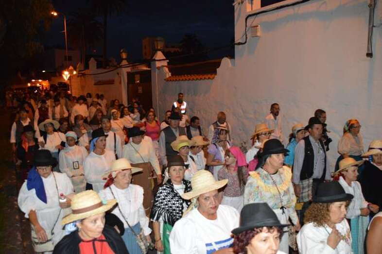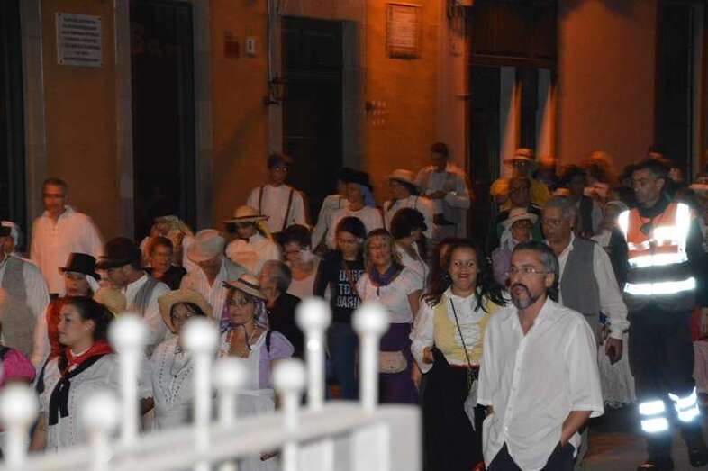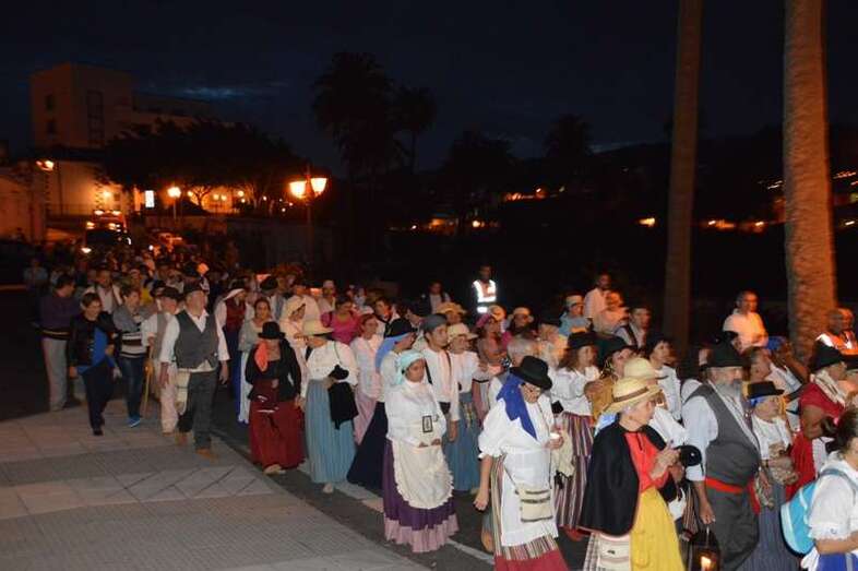 Acompañados de la luz de faroles y tras concentrarse en el recinto público del núcleo fundacional de la ciudad, los peregrinos ataviados con trajes típicos canarios iniciaron al ritmo de la canción Somos costeros interpretada por la Parranda del Vino, cuyos componentes encabezaban la comitiva conformada por vecinos, conocidas caras del movimiento ciudadano y autoridades, entre las que se encontraban la alcaldesa Carmen Hernández y los ediles Gregorio Viera, Diego Ojeda, Marta Hernández y Eloy Santana, todos ellos del Gobierno municipal.