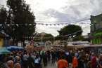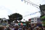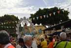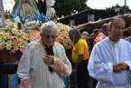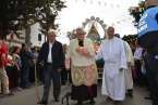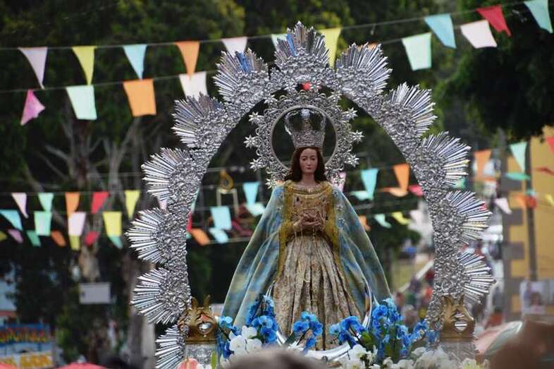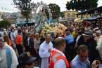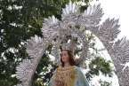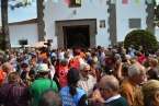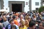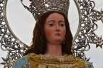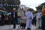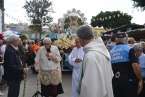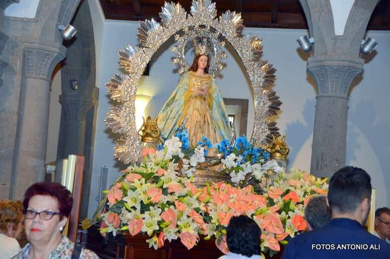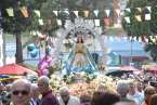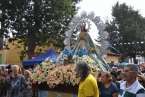 Minutos después de las 13.00 horas, tras la celebración de la eucaristía, un festivo repique de campanas anunciaba la salida de la imagen religiosa. Engalanada con un bello adorno floral elaborado por el diseñador Segundo Amador y un grupo de colaboradores a base de anthuriums, orquideas y liliums de tonos azules, blancos y rosados; era recibida entre aplausos y tracas de voladores.