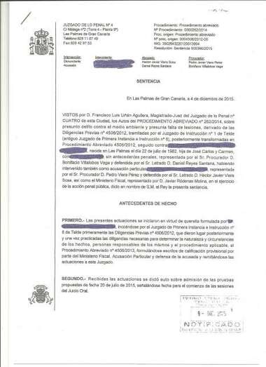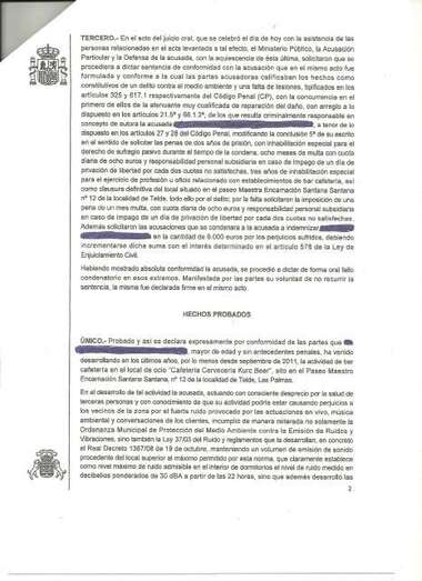 A raíz de la querella que tramitó el Juzgado de Primera Instancia e Instrucción número 6 de Telde, primero como diligencias previas y luego como procedimiento abreviado, el titular del Juzgado de lo Penal determina que la demandada ha cometido un delito contra el medio ambiente y una falta de lesiones al incumplir de “manera reiterada” la Ordenanza Municipal de Protección del Medio Ambiente contra la Emisión de Ruidos y Vibraciones y la Ley del Ruido y reglamentos que la desarrollan. Todo ello al mantener un volumen de emisión de sonido superior al máximo permitido por la normativa vigente, que lo fija en 30 decibelios a partir de las 22.00 horas. Además, en el local se desarrollaban actuaciones en vivo y música ambiental a pesar de no disponer de autorización para ello.