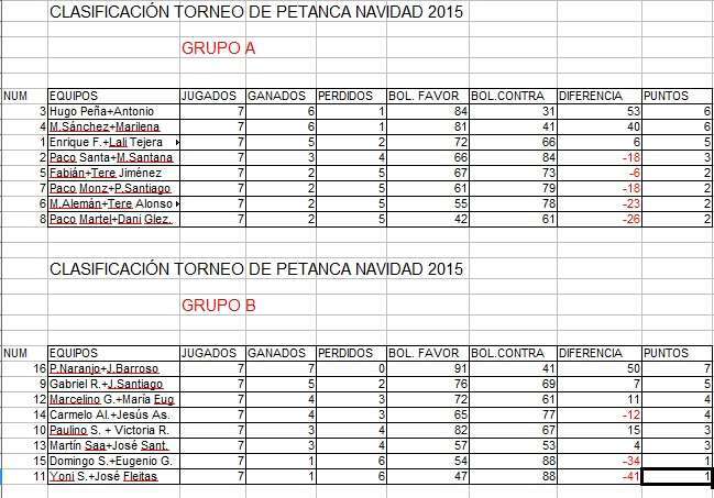 La modalidad ha sido a cancha cerrada y a 13 tantos, enfrentándose todos contra todos dentro de cada grupo. El equipo primer clasificado del Grupo A, formado por la dupleta Hugo Peña y Antonio García, se enfrentó en la mañana del sábado al equipo primer clasificado del Grupo B, formado por la dupleta, Pedro Naranjo y Juan Barroso, jugándose la final del Torneo de Navidad. La final se jugó a 15 tantos y a doble cancha resultando una partida muy reñida, cuyo resultado se inclinó a favor de la dupleta formada por Hugo Peña y Antonio García por 15 a 13, proclamándose ganador del Trofeo de Navidad 2015.