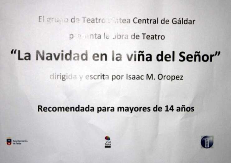 La noche del miércoles 23 de diciembre tuvo lugar a las 20:30 horas en la ermita de San Pedro Mártir de Telde el Grupo de Teatro de Gáldar “Platea Central” escenificó la obra “La Navidad en la Viña del Señor”, escrita y dirigida por Isaac Miguel Oropez Candelaria. Obra que el Grupo de Teatro inició en Gáldar en el Teatro Consistorial el jueves 17 una pequeña gira artística que continuará en Guía en el Teatro Hespérides el pasado sábado 191, finalizando en Telde. Todas estas representaciones.