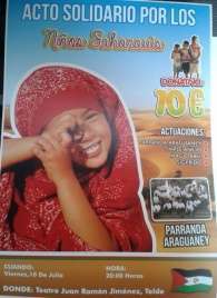 Telde.- Telde vuelve a mostrar su lado más solidario y lo hace con una gala a favor de los niños saharauis. El acto benéfico en cuestión se celebrará este viernes, 10 de julio, en el Teatro Juan Ramón Jiménez a partir de las 20.00 horas. Por lo pronto, están confirmadas las actuaciones de la parranda Araguaney, de Timple Añejo, del mago Abel y de Sigfrido. El precio de las entradas es de 10 euros.
