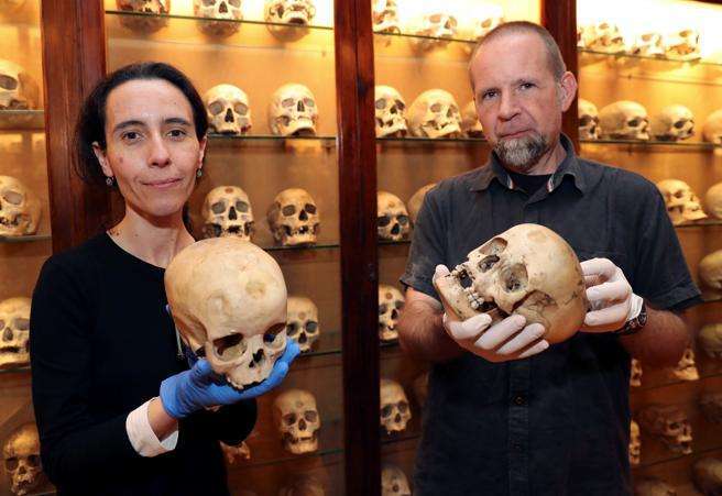 La conservadora del Museo Canario, Teresa Delgado, y el arqueólogo de la Universidad de Las Palmas de Gran Canaria, Javier Velasco, muestran dos de los cráneos de niños estudiados, con fracturas en la parte frontal