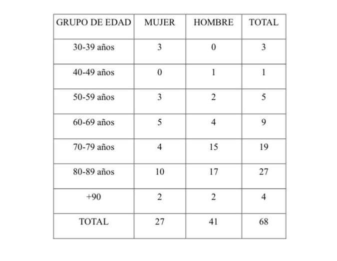 En cuanto a los fallecidos, 27 eran mujeres y 41, hombres. Cincuenta de ellos, el 73 %, tenía 70 años o más. El grupo de edad más afectado es el de 80-89 años, con 27 muertes.