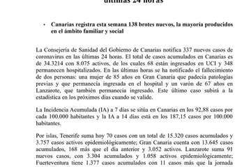 Además, las islas suman 337 nuevos contagios en 24 horas superando así la barrera de los 34.000 contagios desde el inicio de la crisis sanitaria, en concreto Canarias alcanza este miércoles un acumulado de 34.321 casos, según publica Canarias7. De estos, 8.075 siguen activos, 86 están en la Unidad de Cuidados Intensivos (UCI)-los mismos que ayer martes- 348 están ingresados en planta hospitalaria (12 más que ayer) y el resto- 7.659 - bajo tratamiento en sus domicilios.