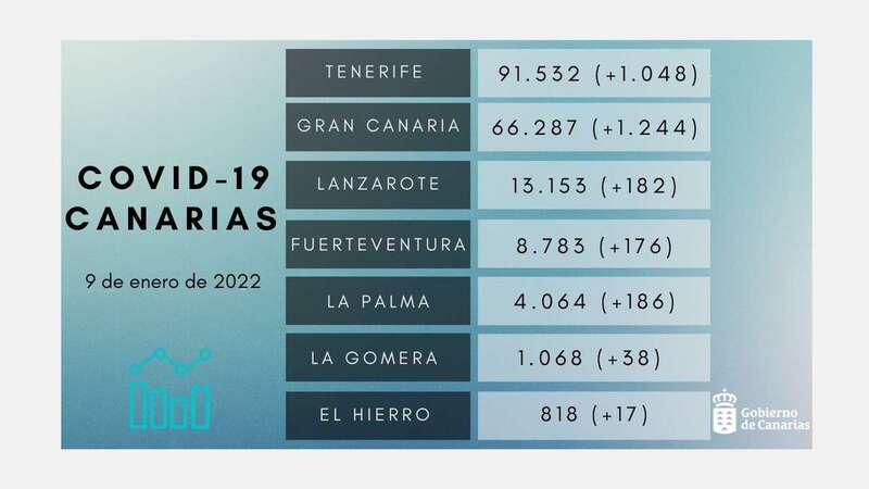 Por islas, Tenerife suma hoy 1.048 casos con un total de 91.532 casos acumulados y 32.911 casos activos epidemiológicamente; Gran Canaria cuenta con 66.287 casos acumulados, 1.244 más que el día anterior, y 22.495 activos. Lanzarote suma 182 nuevos casos con 13.153 acumulados y 4.386 activos epidemiológicamente; Fuerteventura tiene 8.783 casos acumulados, con 176 casos nuevos y 3.430 activos.