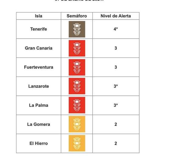 El Gobierno de Canarias ha decidido mantener otra semana más a todas las islas en los mismos niveles de alerta sanitaria que se aprobaron el pasado 7 de enero: 4 para Tenerife (semáforo marrón), 3 para Gran Canaria, Fuerteventura, Lanzarote y La Palma (rojo) y 2 para La Gomera y El Hierro (ámbar).