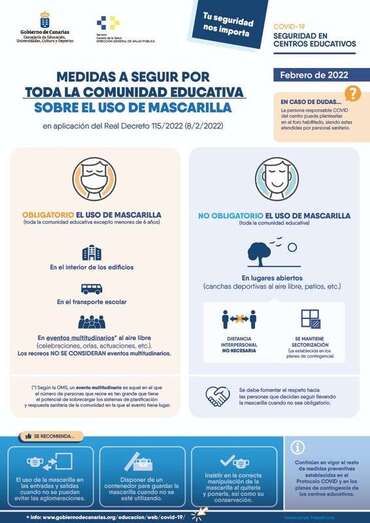 Con la publicación por el Gobierno de España del Real Decreto 115/2022, de 8 de febrero, la mascarilla ha dejado de ser obligatoria en los patios, canchas deportivas al aire libre y lugares abiertos destinados al recreo sin necesidad de mantener la distancia interpersonal, desde este pasado jueves, 10 de febrero; aunque, tal y como se viene haciendo, se mantendrá la sectorización (distribución de los grupos escolares en estos espacios) establecida en los Planes de Contingencia de cada centro educativo. Esta es una de las indicaciones recogidas en el documento enviado ayer a los centros educativos de las Islas por la Consejería de Educación, Universidades, Cultura y Deportes del Gobierno de Canarias- tras una reunión mantenida con la Consejería de Sanidad- para aclarar lo establecido por la nueva norma.