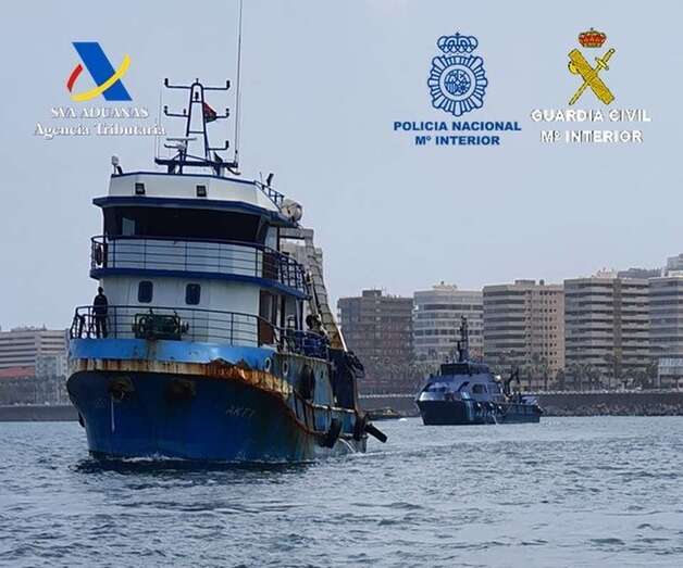 Como consecuencia de ello, la Dirección Adjunta de Vigilancia Aduanera de la Agencia Tributaria estableció el oportuno dispositivo aeronaval que dio como resultado la localización y abordaje del pesquero por parte del patrullero ‘Cóndor’, cuando navegaba con rumbo norte pretendiendo camuflarse entre los habituales pesqueros que toman esa vía de navegación próxima al caladero subsahariano.
