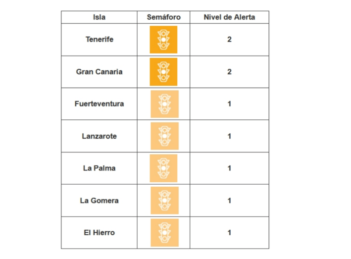 Según este informe, todas las islas continúan en el mismo nivel en el que se encontraban: Tenerife y Gran Canaria en nivel 2, o de riesgo medio, y Fuerteventura, Lanzarote, La Palma, La Gomera y El Hierro en nivel 1.