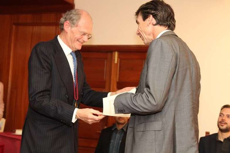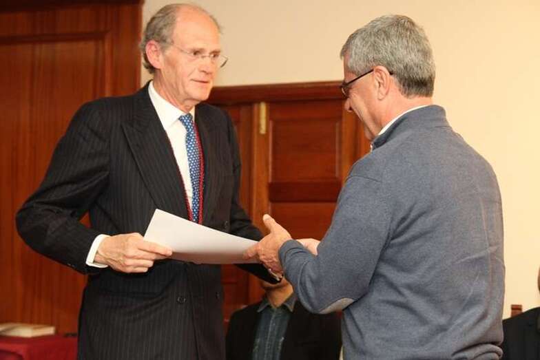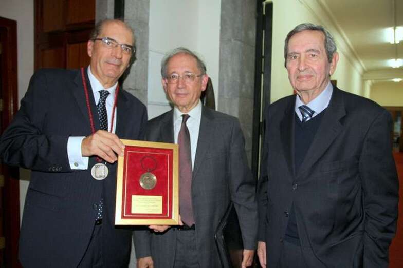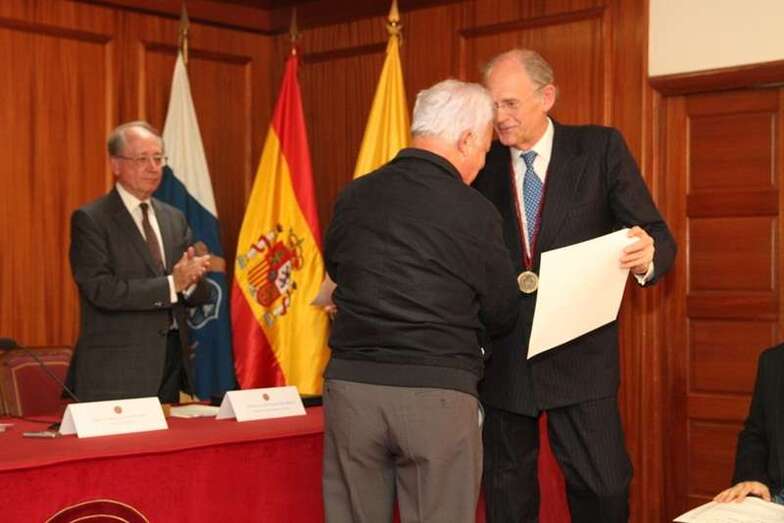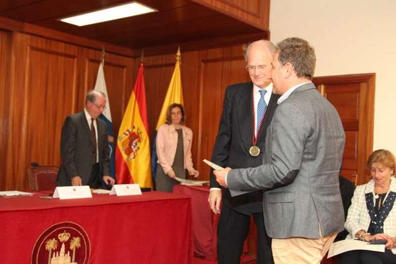 Finalizada la amplia y magnífica exposición del tema histórico tratado, con la intervención del catedrático Pérez Moreda, Tomás Van de Walle hace entrega al conferenciante de la medalla representativa de la Real Sociedad Económica de Amigos del País de Gran Canaria y a la Real Academia de la Historia.