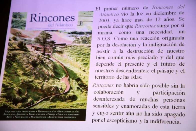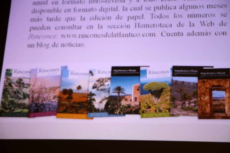 Con el agradecimiento al Círculo Cultural de Telde, al Colectivo Ecologista Turcón y a Fernando Ojeda por su presentación, se inician las intervenciones en la que el Coordinador Fernández Galván y el miembro del Consejo Asesor de la obra, Arnoldo Santos, expresan desde sus comienzos los motivos y proyectos básicos que dieron lugar a esta excepcional obra Rincones del Atlántico, porqué nace, cómo nace, etcétera: “Para la difusión del conocimiento, la valoración y protección del paisaje y el patrimonio. Completa este volumen un monográfico en tres tomos, editado por Rincones del Atlántico, dedicado a la arquitectura tradicional de las Islas Canarias, especialmente a la doméstica, pero sin olvidar las otras arquitecturas rurales. Un trabajo multidisciplinar titulado “Arquitectura y Paisaje”, que incluye a todas las islas del archipiélago y el cual el paisaje, el entorno y la vegetación tienen, junto a la arquitectura, un protagonismo fundamental.
