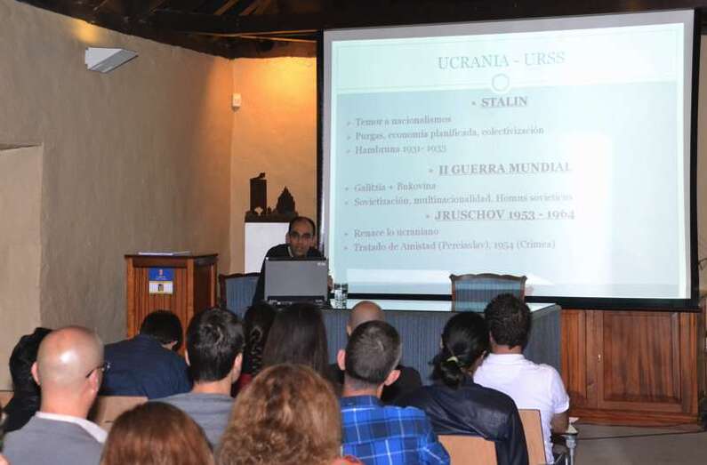 “En ambos procesos la sociedad de Ucrania ha buscado alejarse de la herencia zarista y soviética y construir un nuevo país democrático e integrado en las estructuras políticas, sociales y económicas de Occidente. Enfrente tiene a la Rusia dirigida por Vladimir Putin, dispuesto a impedirlo, aunque para ello tenga que romper el orden internacional establecido tras el final de la Guerra Fría anexionándose Crimea e instigando (sin gran éxito) el separatismo  en las regiones del sureste de Ucrania”, concluyó el conferenciante.