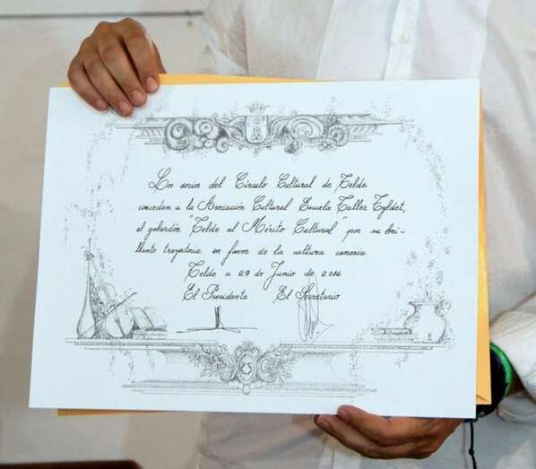 El diploma acreditativo del Premio es entregado por don Sebastián Sánchez Grisaleña en el que se especifica lo siguiente: “Los socios del Círculo Cultural de Telde conceden a la Asociación Cultural Escuela Taller Tyldet, el galardón Telde al Mérito Cultural por su brillante trayectoria a favor de la cultura canaria. Telde a 29 de junio de 2016. Firmado El Presidente y el Secretario”.