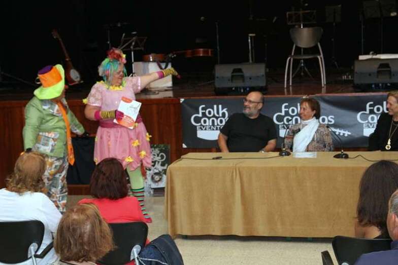 Mari Carmen y Federico, Lalivina y Ferrico, nos acompañan en ese viaje en el tren de colores, acariciando la barriguda sabelotodo, entrando en la casa encantada, para retomar los recuerdos de Pino y explicar a un niño el porqué de la culpa del arco iris, y todo para entender al gato que no quería maullar, con humor, risas, preguntas y respuestas fáciles de digerir, porque en su diálogo sencillo, desenfadado, gracioso, picarón, con buena y excelente declamación y conocimiento del habla canario, buen ritmo escénico. Lalivina y Ferrico, nos hicieron pasar un rato inolvidable. Muy divertido y a propósito, en su justa medida para presentar un cuento infantil, con muchas ganas de que vuelvan a interpretar este relato desde su punto de vista, el de dos clown que en su imaginación y la manera de exponer el relato, pudimos entender mucho mejor el mensaje del libro. Enhorabuena por esta original manera de introducirnos en el mundo infantil mediante este cuento de Pino Monzón Padrón: El gato que no quería maullar. Libro de Beginbook Ediciones, con diseño de cubierta, Maquetación y cuidado de la edición a cargo de Jorge A. Liria.