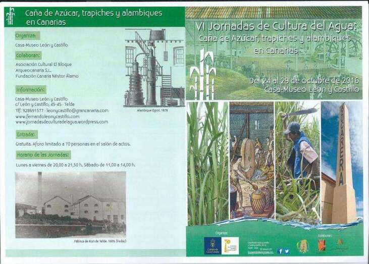 La Casa-Museo León y Castillo y la Asociación Cultural El Bloque, continuando con su labor de promoción y difusión de los valores del Patrimonio Cultural, organizan las VI Jornadas de Cultura del Agua, bajo el lema: Caña de azúcar, trapiches y alambiques en Canarias, que se desarrollarán en dicho centro museístico teldense dependiente de la Red de Casas Museo del Cabildo de Gran Canaria entre el lunes 24 y el sábado 29 de octubre.