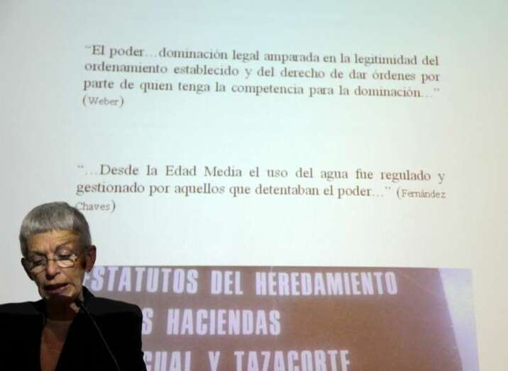 Inicia este primera Jornada después de las presentaciones e inauguración la doctora Ana Viña Brito imparte la ponencia Relaciones de Poder en torno al agua, expone: “Buenas noches quiero dar las gracias por haber sido invitada a estas VI Jornadas sobre el Agua, el título de las Jornadas se centra sobre todo en la caña de azúcar, los ingenios y cuál es su significado. No sólo me voy a limitar a hablar del agua en relación con la caña de azúcar, al ser la primera ponencia de este ciclo, decidí que habían otros aspectos que me parecían interesantes tratarlos, cómo era el agua en cuanto al abastecimiento urbano, porque gran parte de esos grandes propietarios de caña de azúcar en un momento determinado residen en la ciudad, y lo que van a hacer con esa agua en cuanto a abastecimiento es prácticamente la misma situación que podríamos ver en el mundo rural.