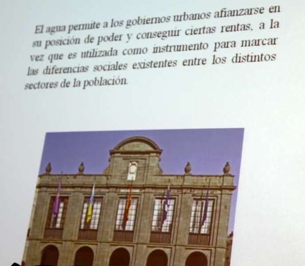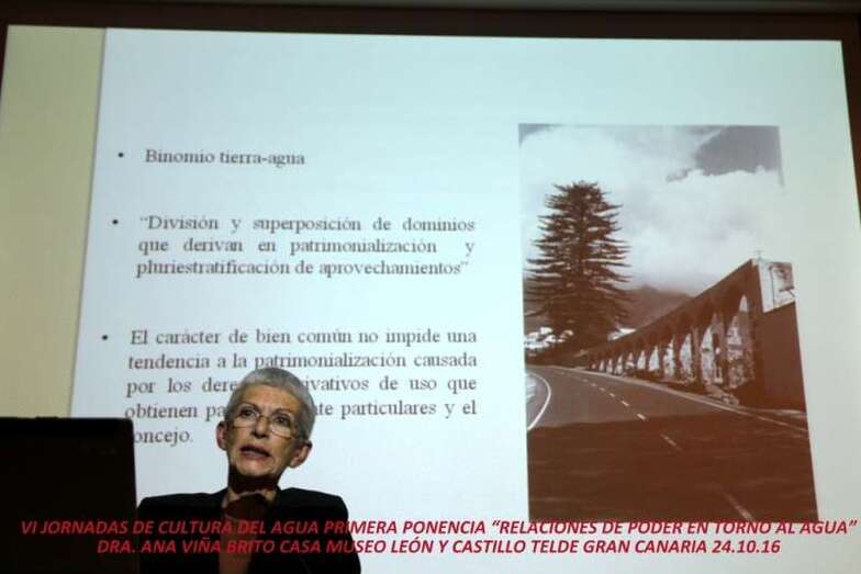 Una amplia exposición de las relaciones históricas del poder efectivo del agua, que la profesora Viña Brito nos ha acercado a su proceso y conocimiento del elemento vital de la naturaleza, del que aún en numerosos países del llamado tercer mundo se ven en la imposibilidad de su uso, por la escasez, por no contar con los medios económicos e industriales para su captación, por la explotación y consecuencias del abuso industrial indiscriminado con el efecto contaminante del preciado líquido, el agua nuestra de cada día. En los corredores de la planta superior de la Casa Museo se exhiben los paneles informativos, elaborados por el archivero, bibliotecario y Técnico de Museos, Juan Ismael Santana Ramírez, un trabajo excelente realizado con rigor, magníficamente documentados, diseñados, y con imágenes referentes a los temas y ponencias que se tratarán en las VI Jornadas de la Cultura del Agua, que se celebran en la Casa Museo León y Castillo de Telde. Muchas gracias.