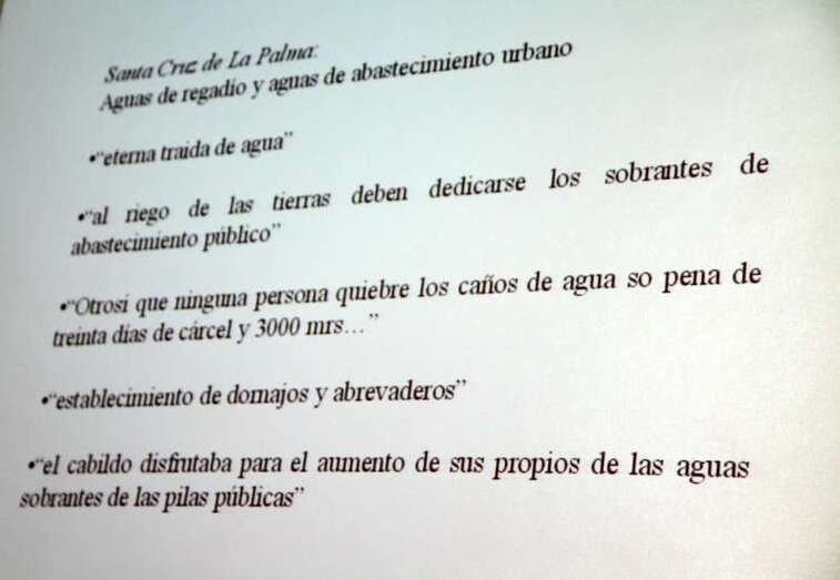 El planteamiento son las primeras concesiones de tierras y uso del agua, al disponer de capital suficiente para la traída del agua, tanto para el regadío como para la industria que lleva aparejada estos grandes propietarios consideran que si ellos han aportado el capital, el agua es de propiedad privada y el Consejo normalmente no se opone, ¿por qué no se opone?, porque gran parte de sus propietarios son los propios regidores, tenientes de gobernador, escribanos, etc”.