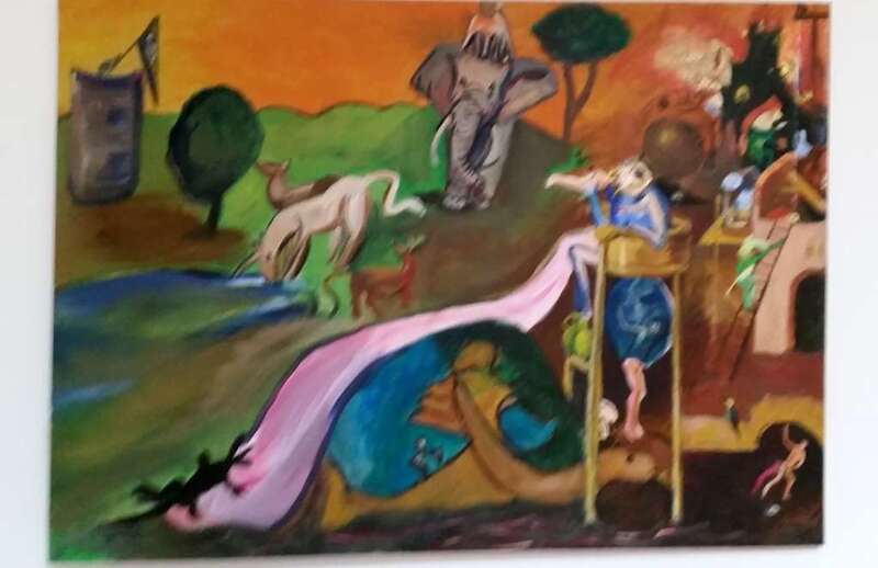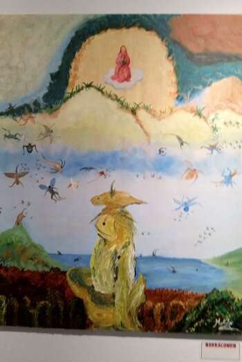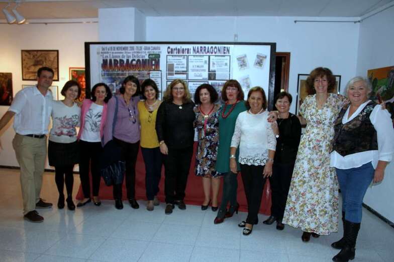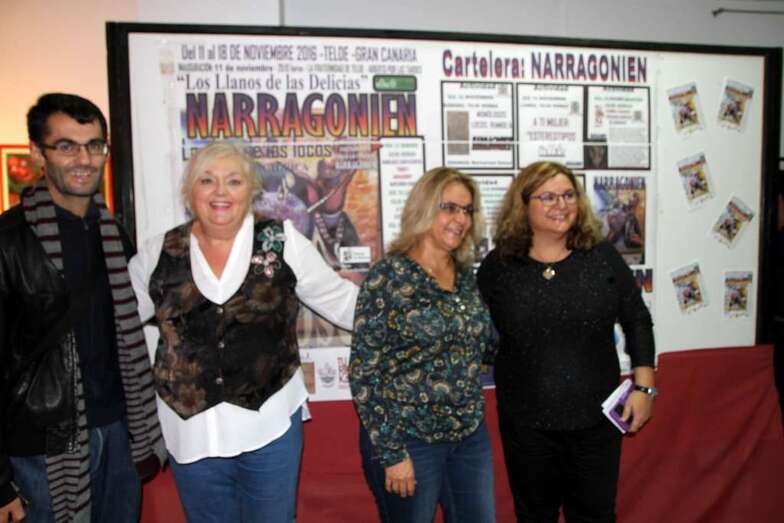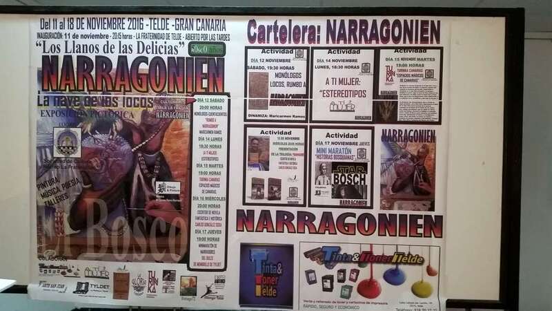 Yo estoy participando con ellos activamente hace dos años como dinamizadora porque yo me siento también parte de esta familia de locos divinos. Narragonien es una realidad que se nos hacía lejana. Ayer con José al terminar esta muestra él hizo un balance de todo lo acontecido desde diciembre pasado que no se ha parado, ha estado apoyando las exposiciones individuales de sus alumnos y alumnas y además este año se han realizado tres muestras colectivas Sanmao-EcoChen, el cuarto centenario de la muerte de Cervantes que también se llevó al Centro Insular de Turismo logrando un rotundo éxito de participación y de gente que estuvo viéndola, y la de El Bosco que siempre estuvo presente hasta ahora en Narragonien.
