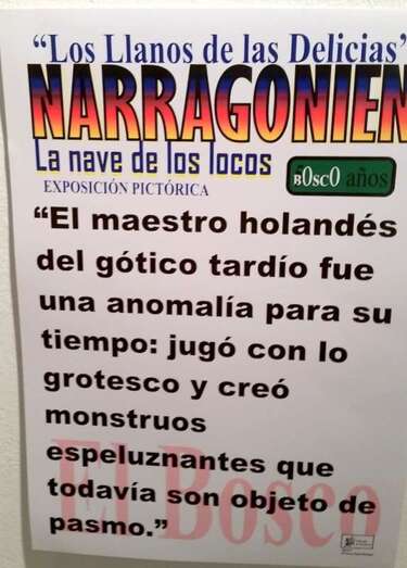 En mi intervención partiendo en el viaje hacia Narragonien, navegamos por el tiempo hacia la tierra prometida de los locos, una metáfora pictórica que El Bosco establece entre el vicio y la locura advirtiendo de una manera burlesca la pérdida de los valores eclesiásticos, y la corrupción del clero, la mala relación de los hombres con la religión que les conduce a la negligencia o locura. Descripciones de situaciones grotescas, ridículas, con símbolos representando la herejía, la muerte, connotaciones eróticas, vicios humanos.