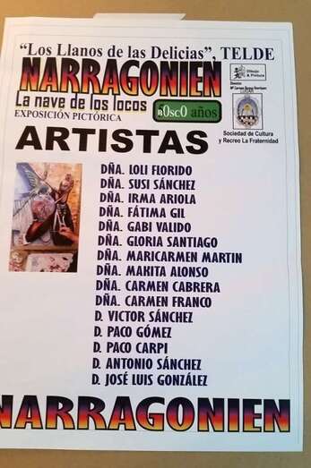 Felicito a todos los artistas por el entusiasmo y la búsqueda constante de la composición. Estoy muy orgulloso de todos ustedes. La foto del cartel pertenece al cuadro de la artista Loli Florido. Queremos terminar agradeciendo a la Sociedad  de Recreo y Cultura La Fraternidad, a don Ramón Santana, Presidente y don José Luis Macías junto al resto del equipo directivo y personal por el trato que hemos recibido y abrir las puertas a Narragonien. Esta sociedad no lo está pasando muy bien, pero decires que nos tiene a nosotros para apoyarles aunque sea desde el punto de vista pictórico. Hago un llamamiento para que intentemos apoyar a esta sociedad casi centenaria, seguro que entre todos podemos.
