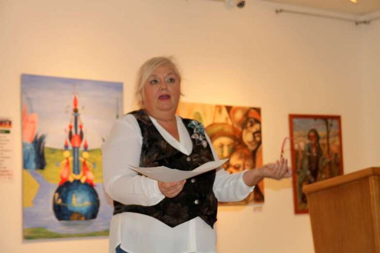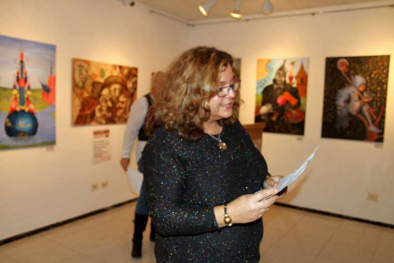 Irma Arola recita su poema El Bosco, pintor de leyenda: “Hombre de leyenda/ El carro del heno y El jardín de las delicias/ representan la locura humana,/ el humanismo de la edad Moderna se observa,/ actitud expresiva de sus personajes,/ surrealismo es tu universo/ de símbolos e imágenes grotescas/ que parecen sacadas de una pesadilla./ En tus obras prevalecen los demonios/ o figuras medio humanas/ y medio animales./ Tu pincel plasma/ paisajes tranquilos y encantadores./ Tu paleta se transporta al universo,/ mientras,/ pintas los cuernos/ hasta descender al infierno”.
